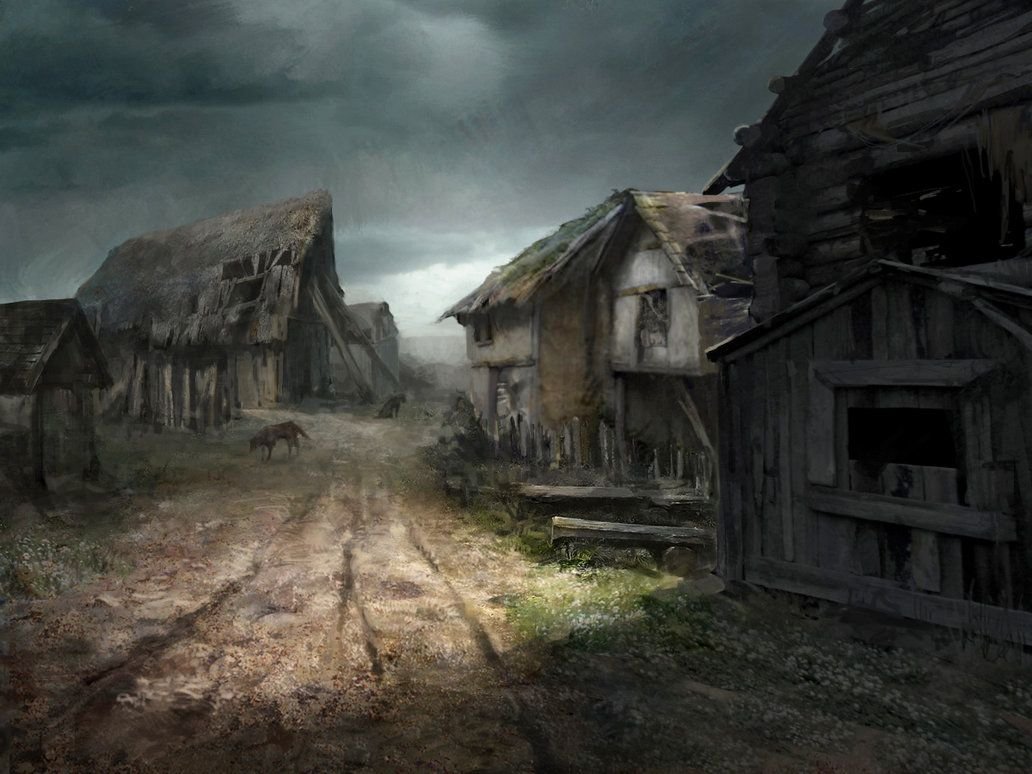 ![Полуразрушенная деревня фэнтези арт]()