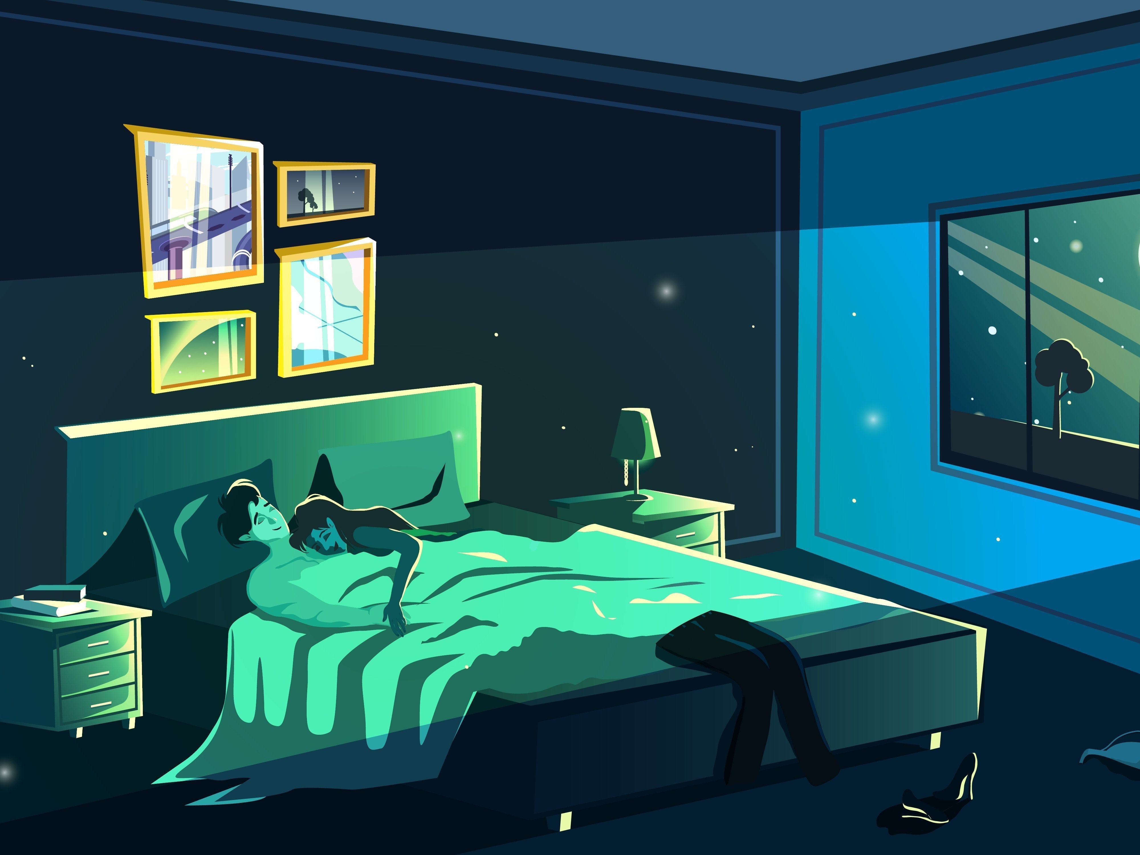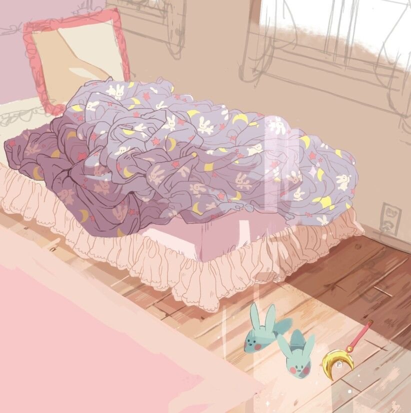 ![Аниме кровать ночью]()