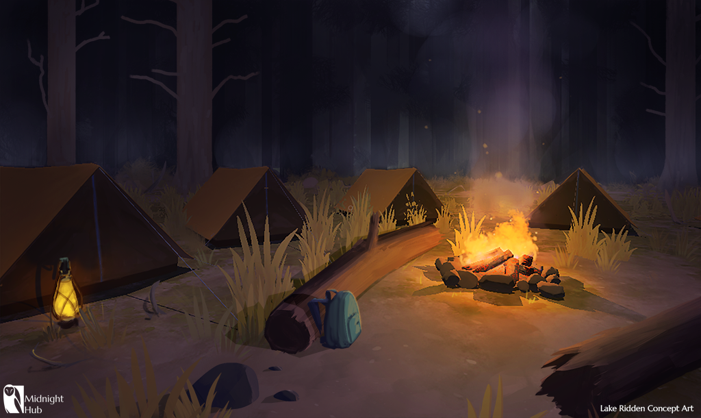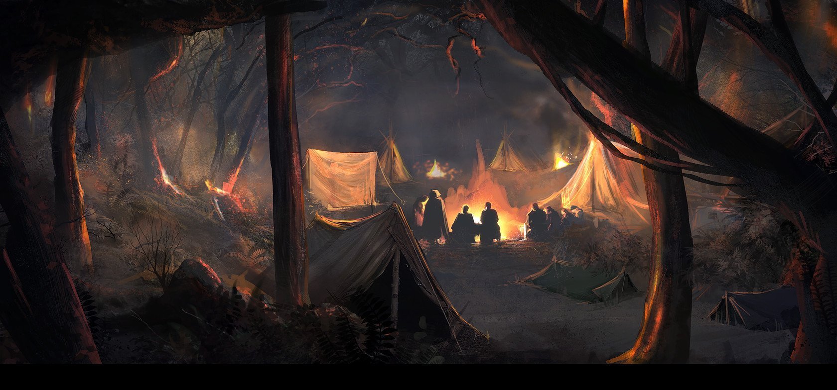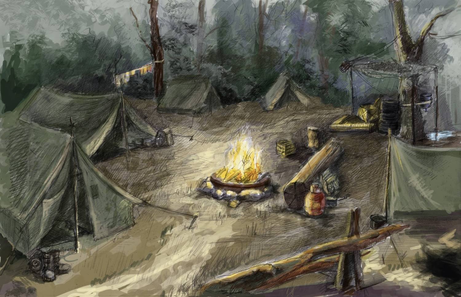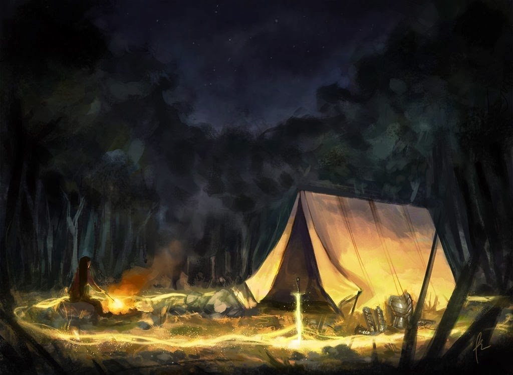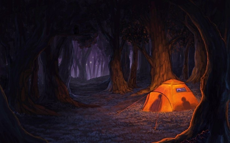 ![Лагерь у костра в лесу арт]()