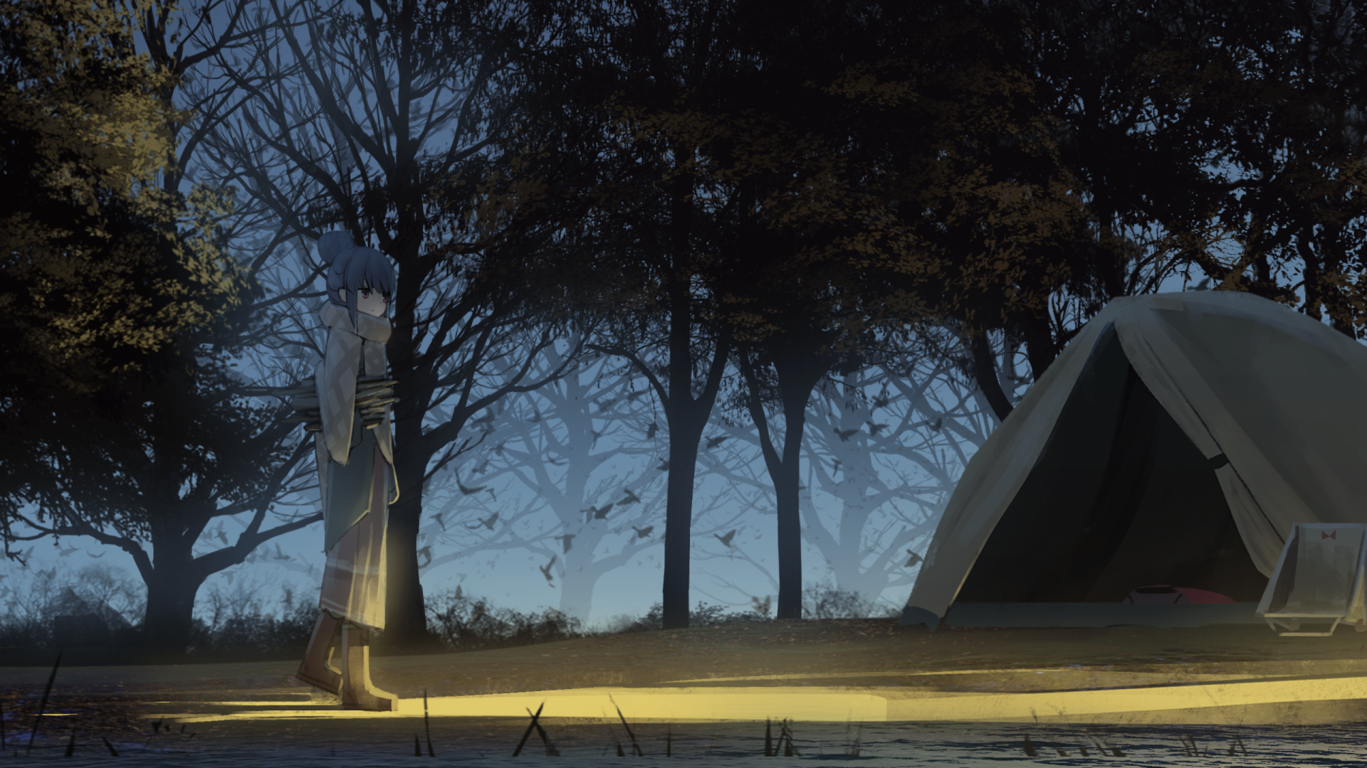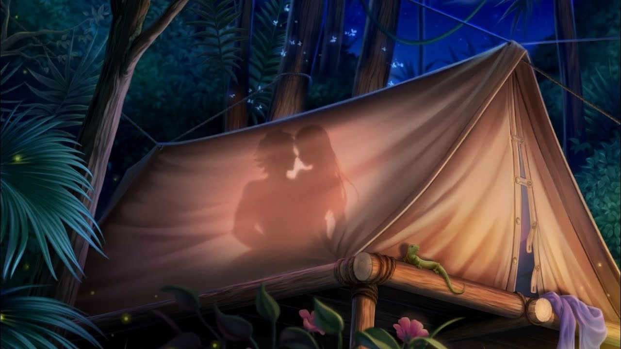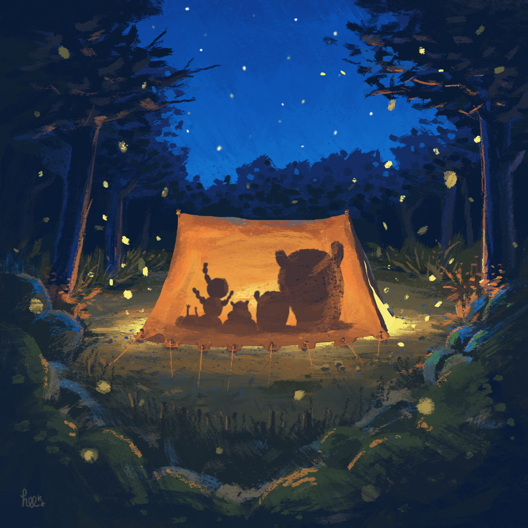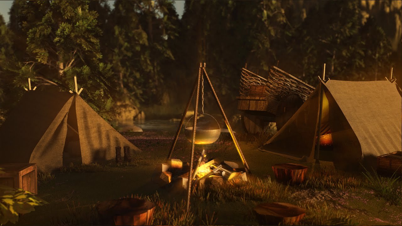 ![Лагерь у костра в лесу арт]()