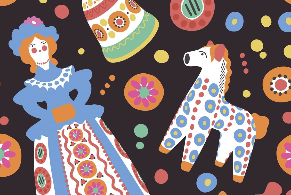 Элементы дымковской росписи барышни