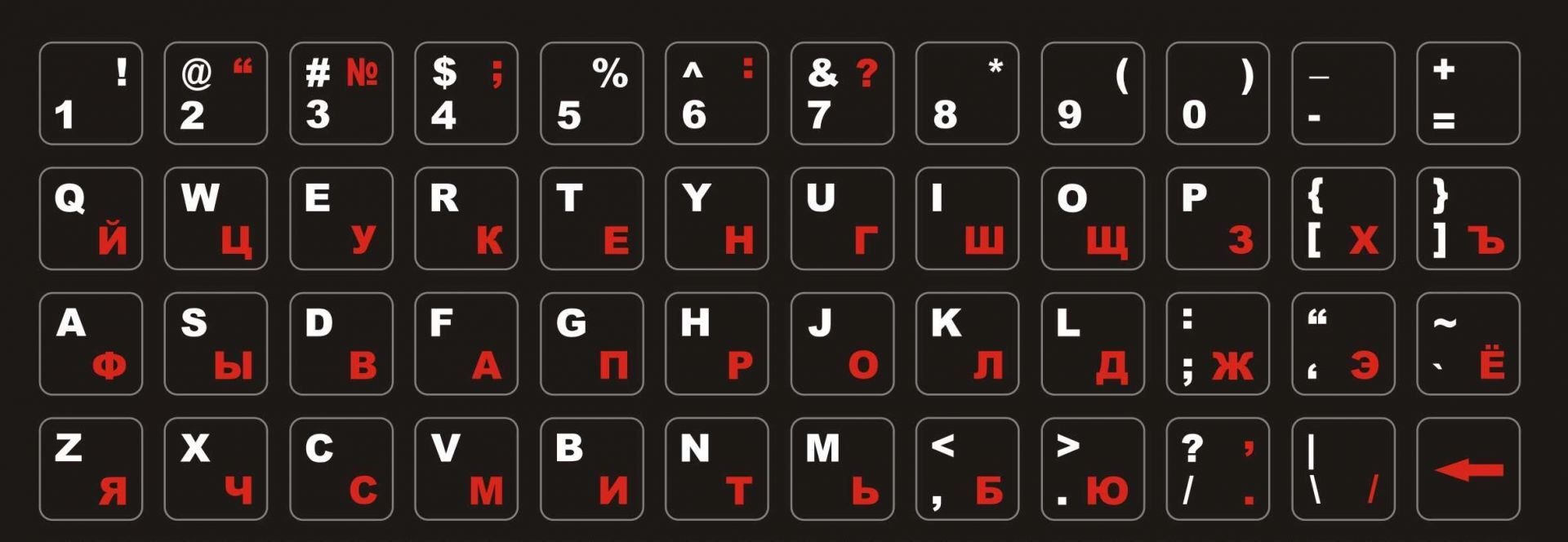 ![Наклейки на клавиатуру ноутбука с русскими и английскими буквами]()