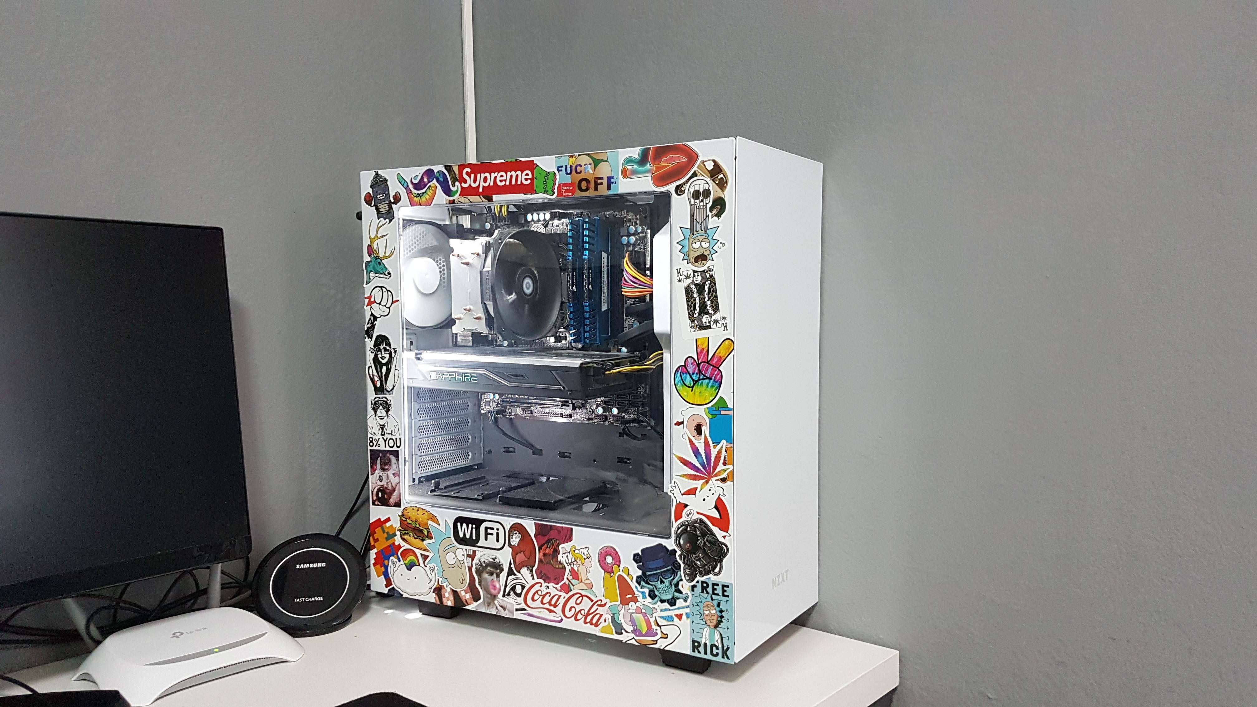 ![ПК обклеенный наклейками]()