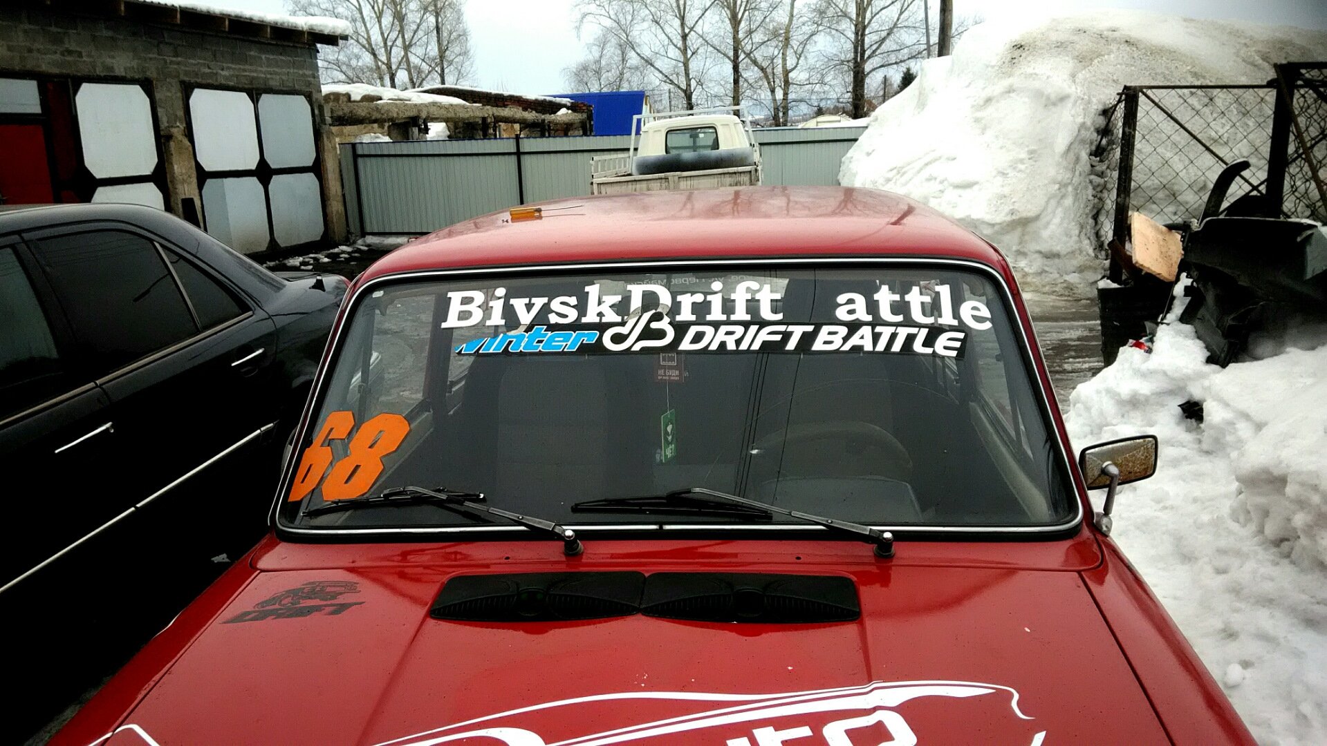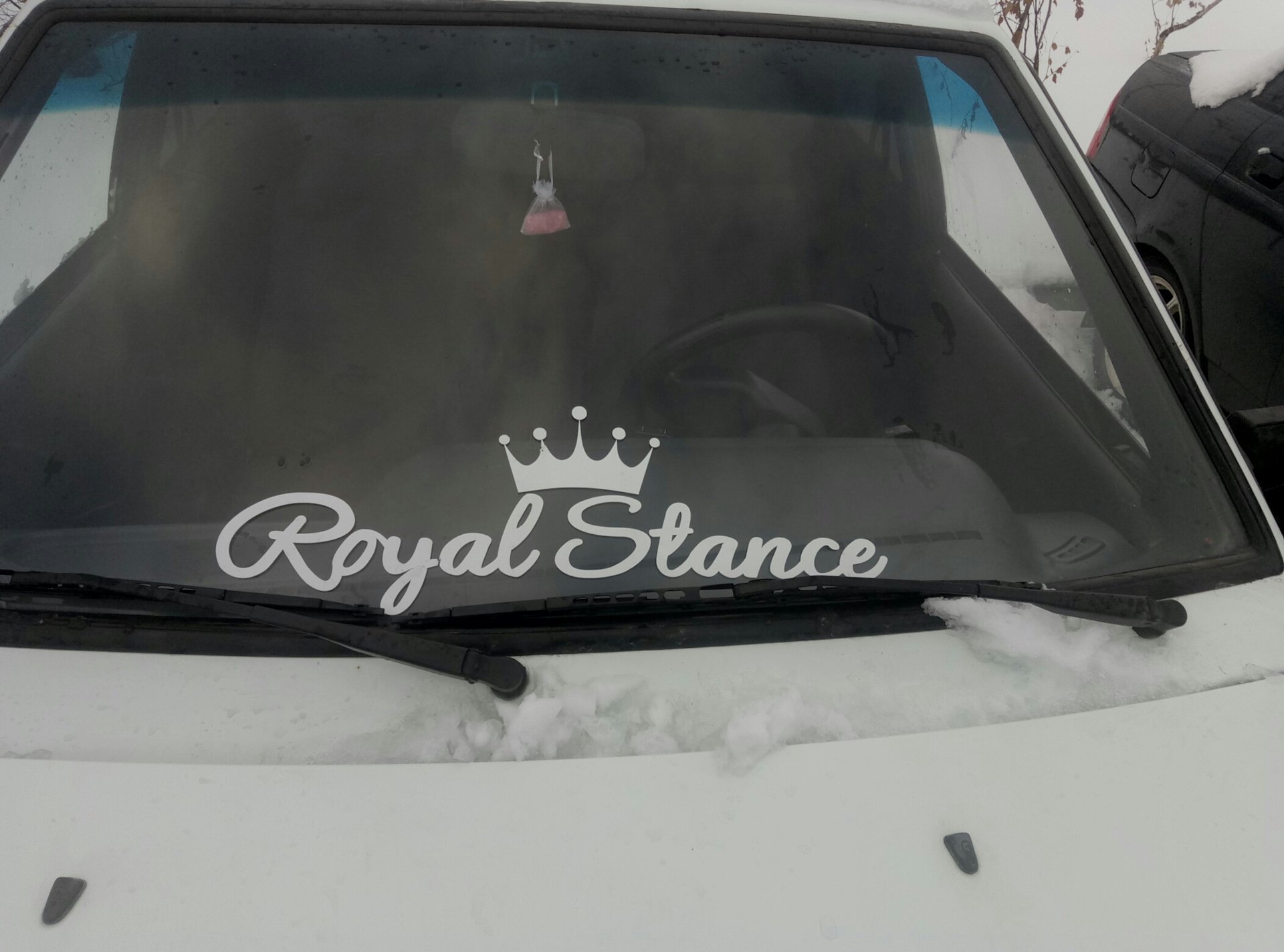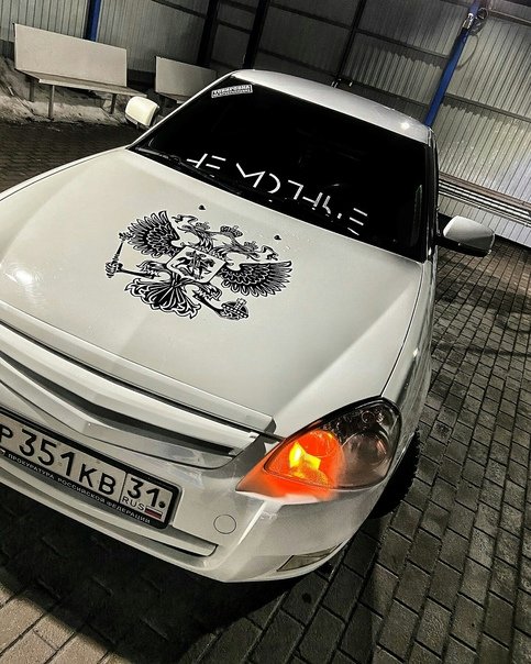 ![Белая Приора с наклейкой на лобовом]()