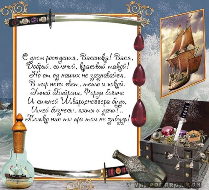 Хотите порадовать своего друга или близкого человека особенным и оригинальным способом? Поздравительная открытка с Василием - это именно то, что вам нужно! Необычные и яркие дизайны, прекрасно передающие праздничное настроение, а также качественные материалы делают каждую открытку с Василием уникальной и запоминающейся. Выбирайте из множества вариантов и отправляйте теплые и искренние пожелания вашим близким с помощью этих ярких и стильных открыток с Василием!