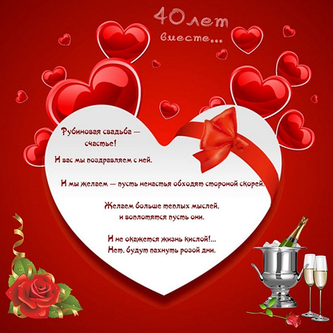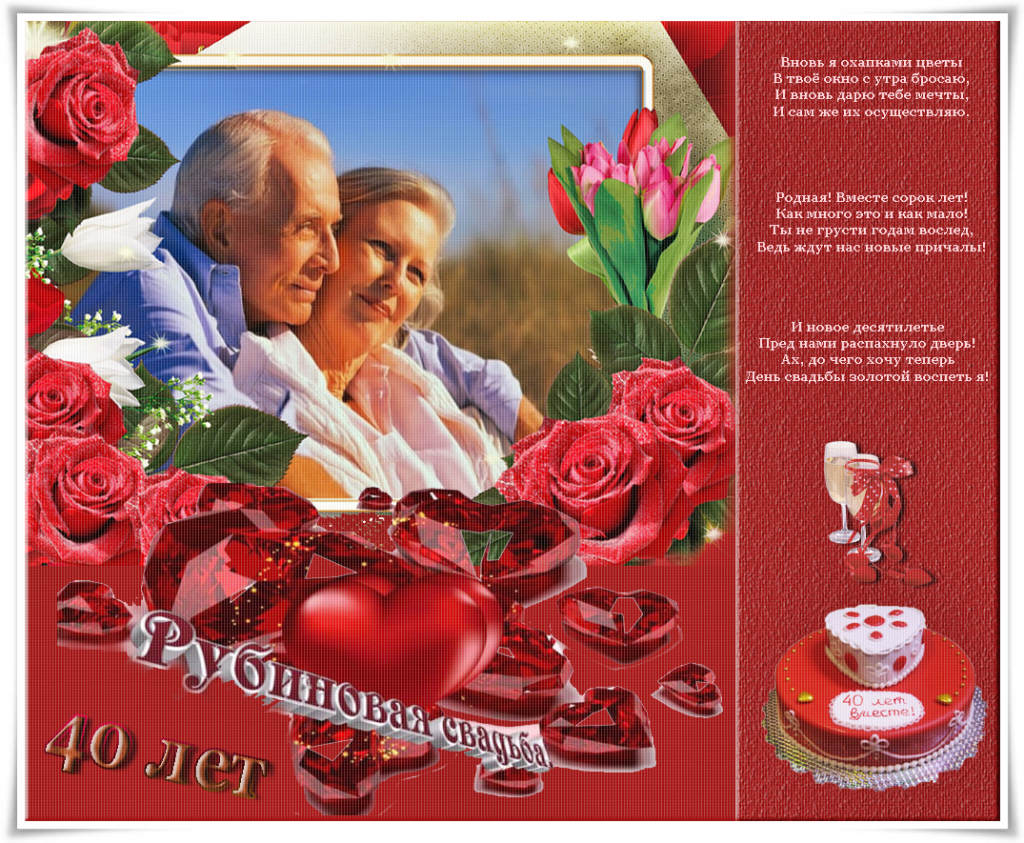 40 лет свадьбы - это особый юбилей, который заслуживает особого внимания и празднования. Именно поэтому открытка становится прекрасным способом поздравить юбиляров и выразить им свою радость и уважение. Ваша открытка может быть оформлена в тематическом стиле, с использованием символов 40-летия - рубина или изумруда, которые являются символами прочности и красоты долгой супружеской жизни. Вы можете написать теплые слова поздравления, поделиться воспоминаниями о счастливых моментах, которые пара пережила вместе, а также пожелать дальнейшего процветания и любви. Пусть ваша открытка станет ярким и запоминающимся моментом на этом важном пути двух любящих сердец.