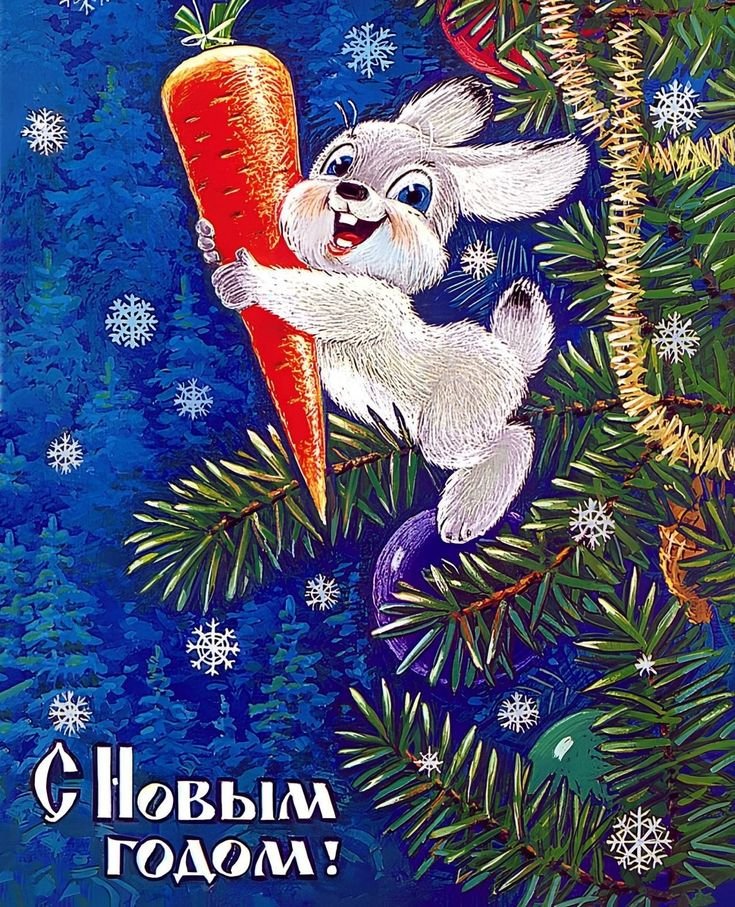 ![Советские новогодние открытки с зайцем]()