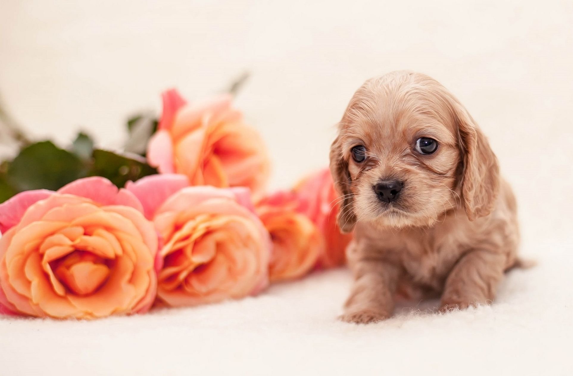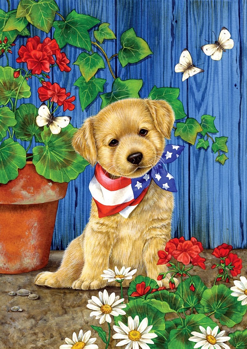 ![Щенок с цветами]()
