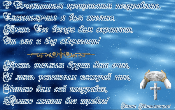 Крещение сочельник – это одно из самых значимых событий в жизни каждого человека. В этот день осуществляется обряд крещения, который символизирует переход от прежней жизни к новой, более духовной. На этот праздник мы всегда стараемся подготовить душевные и теплые поздравления для наших близких и друзей. Открытки с пожеланиями становятся неотъемлемой частью этого праздника, они передают весь наш восторг и радость от такого события. Такие открытки наполнены светом, нежностью и любовью, они помогут выразить все теплые чувства к тому, кто стоит у истоков своего нового духовного пути. Поздравления, написанные на этих открытках, будут ярким и замечательным дополнением к такому важному событию.