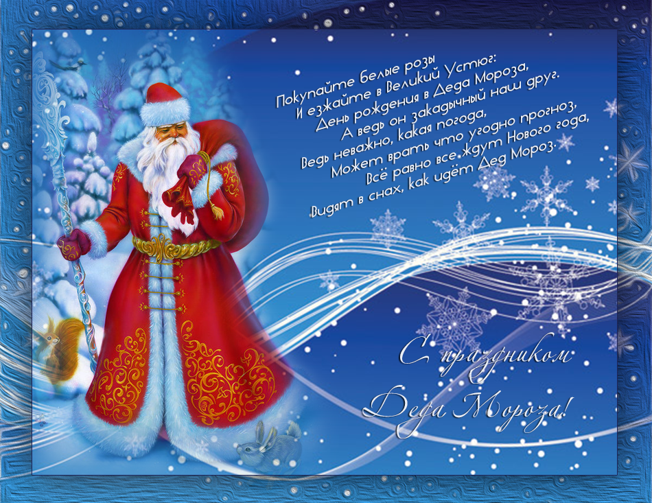 Холодные зимние дни приходят, и вместе с ними наступает самое заветное время года - новогодние праздники. И кто может быть более символичным и важным персонажем в это время, чем Дед Мороз? Он воплощает все те магические моменты, которые мы ждем от Нового года: подарки, уют, счастье и радость. Именно поэтому мы создали особую открытку для самого великого волшебника на свете – Дедушки Мороза. В ней каждая деталь продумана с любовью и заботой, чтобы передать те самые пожелания и благодарность за всю его работу. Отправляя эту открытку, вы не только поздравите Дедушку Мороза, но и привнесете частичку волшебства в свою жизнь. Пусть эта открытка станет вашим личным посланием, наполненным теплом и добрыми пожеланиями для самого доброго и щедрого персонажа, который делает наш Новый год по-настоящему волшебным!