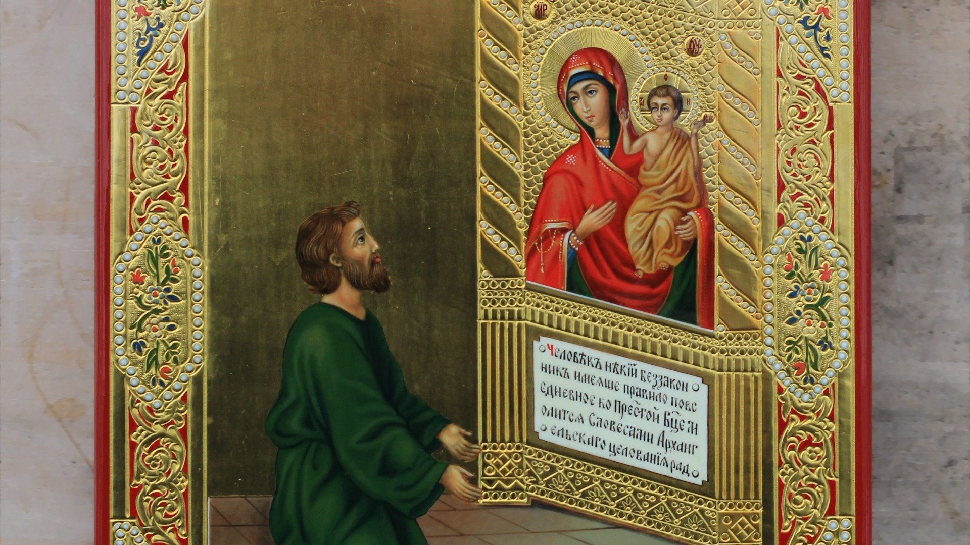 Икона Нечаянная радость зеленого цвета