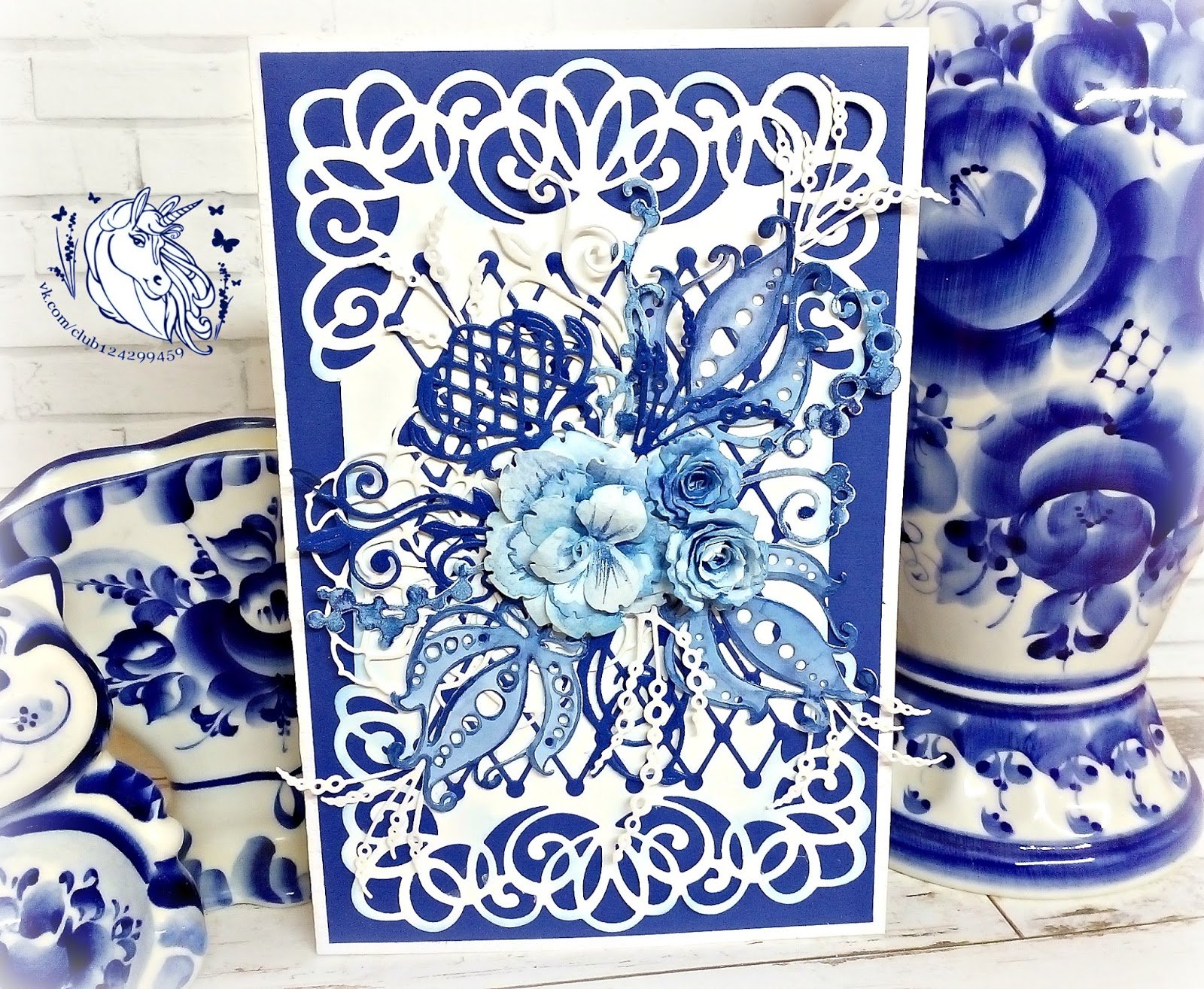 ![Открытка своими руками в стиле Гжель]()