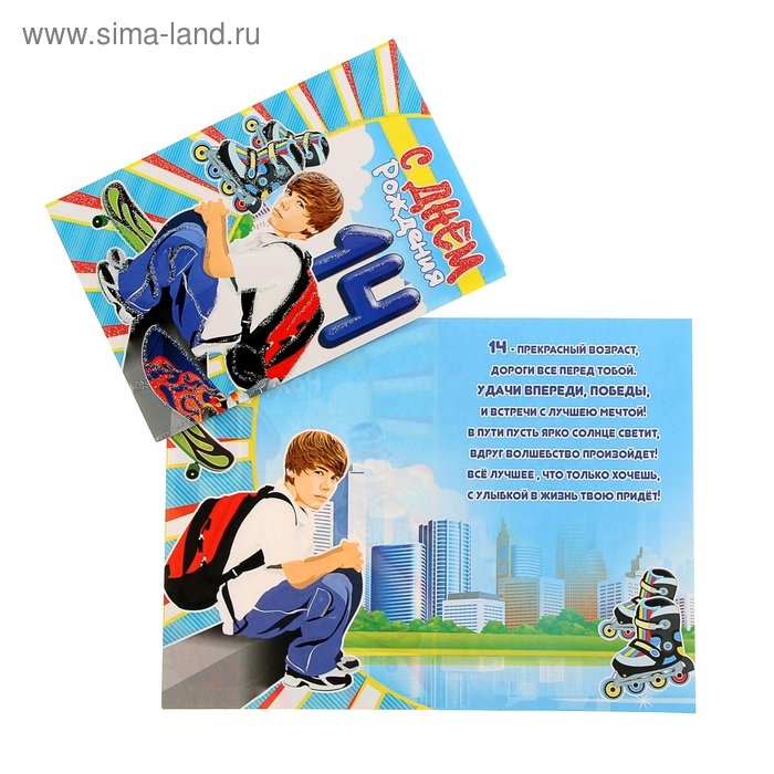 14 лет - это особенный и важный юбилей, который заслуживает праздничных поздравлений и теплых слов. Наша открытка специально создана для того, чтобы передать все самое лучшее и пожелать молодому человеку счастья, успехов, здоровья и исполнения всех его мечтаний. Пусть эти 14 лет станут новым этапом его жизни, наполненным радостью, уверенностью и незабываемыми моментами. Поздравляя с этим значимым днем, мы хотим подарить яркую и запоминающуюся открытку, которая будет напоминать о том, что каждый день - это шанс для новых достижений и возможностей.