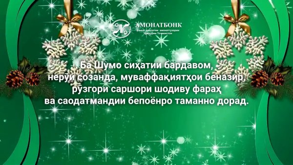 Хотите порадовать близкого человека и пожелать ему счастья и удачи? Тогда открытка "Соли нав муборак" - это то, что вам нужно! Эта яркая и красочная открытка станет прекрасным подарком на Новый год или другое праздничное событие. Она выполнена в традиционном национальном стиле и олицетворяет добрые пожелания и позитивные эмоции. Подарите радость и добро своим близким с помощью открытки "Соли нав муборак"!