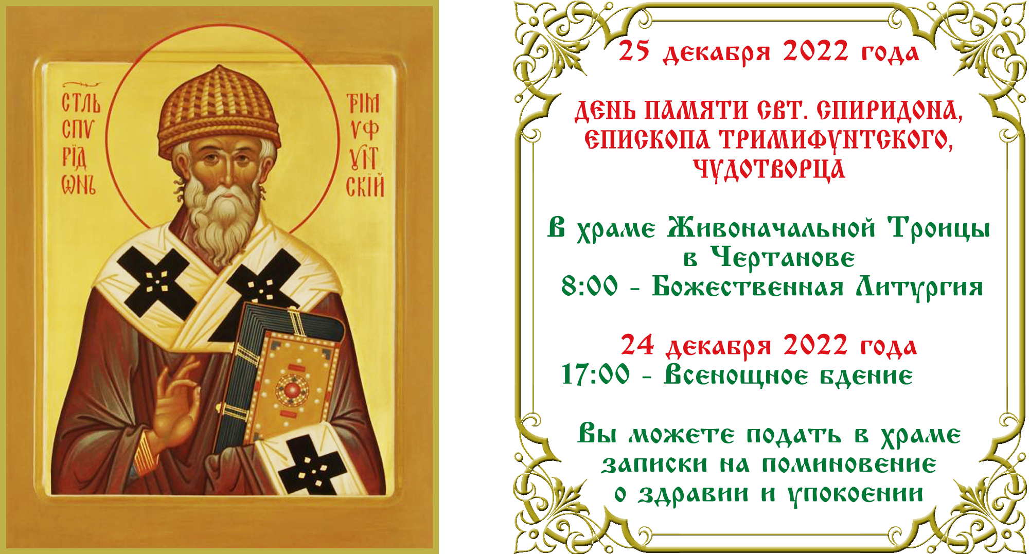 День памяти святителя Спиридона Тримифунтского, Чудотворца 25 декабря