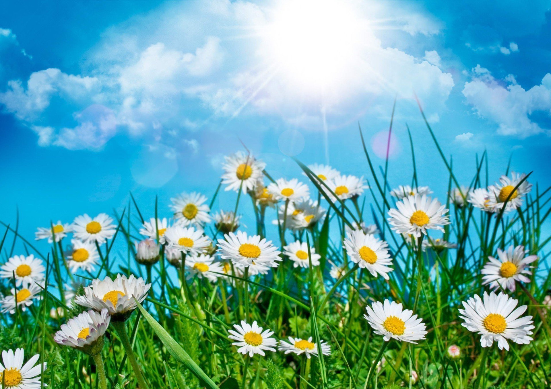 ![Ромашки на фоне голубого неба]()
