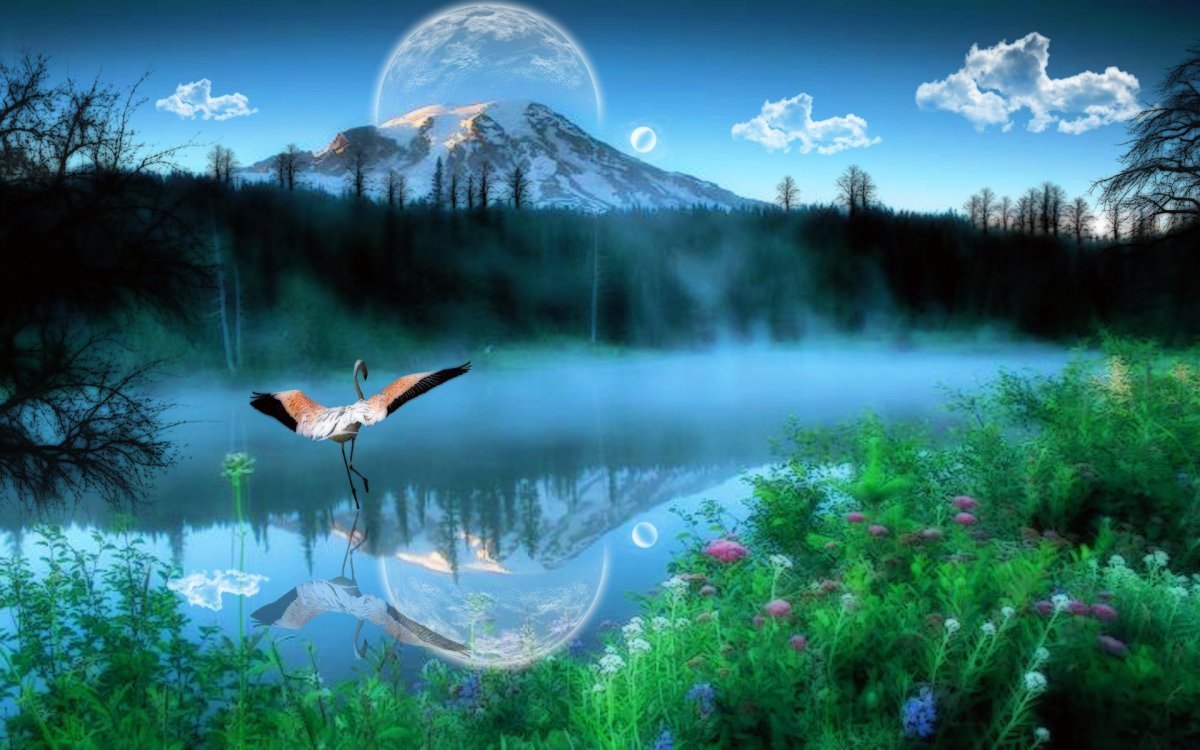 ![Сказочное озеро с лебедями]()