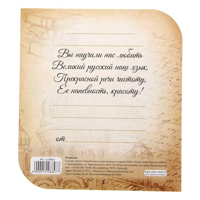 Открытка учителю русского языка - это прекрасный способ выразить благодарность и признательность за терпение, знания и усилия, которые учитель вкладывает в свою работу. Она позволяет передать слова признания и похвалы, а также поделиться своими искренними чувствами и пожеланиями. Ведь учитель русского языка не только помогает нам развивать навыки письма и чтения, но и открывает двери в мир культуры и литературы, расширяет наши горизонты и помогает становиться более эрудированными и грамотными. Поэтому, отправляя открытку учителю русского языка, мы выражаем свою признательность за его труд и вклад в наше образование.
