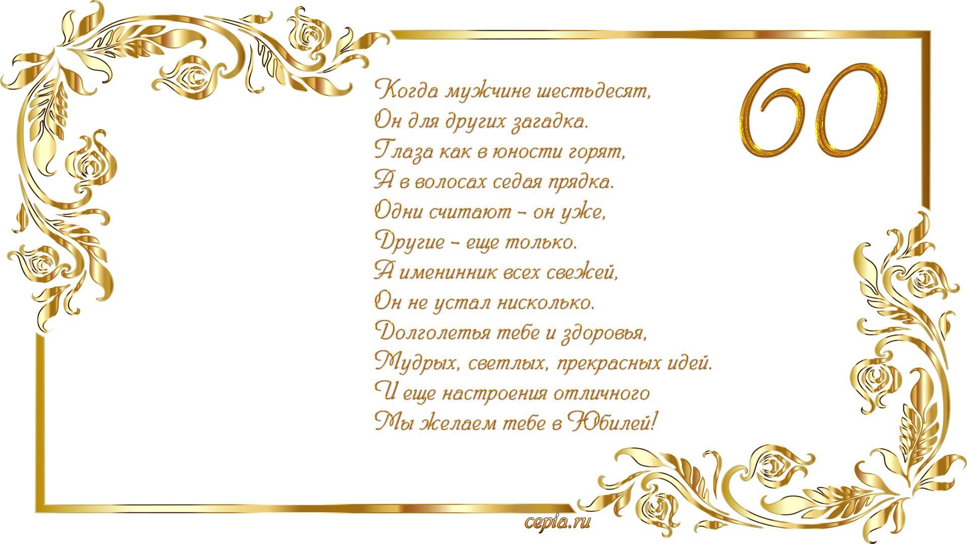 Жизнь – это непрерывное путешествие, и каждый год, каждый юбилей – это новая веха на этом пути. Сегодня мы отмечаем замечательный юбилей – 60-летие вашего мужчины, который сияет сильной энергией и мудростью. Это время, когда мы можем остановиться и взглянуть назад, на все достижения, радости и испытания, которые преодолел ваш мужчина. Открытки с поздравлениями для мужчины с 60-летием становятся своеобразным символом благодарности за его труд и преданность. Пусть каждая открытка будет наполнена добрыми пожеланиями, здоровьем, счастьем и прекрасными моментами, которые еще предстоит пережить! И пусть этот юбилей станет началом новых удивительных приключений и бесценных моментов жизни!