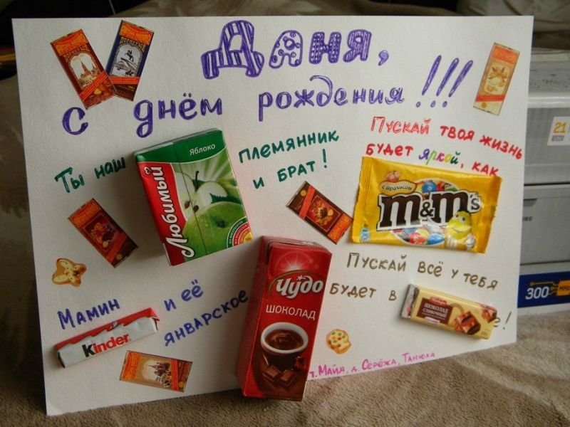 ![Подарок маме на плакате с шоколадками]()