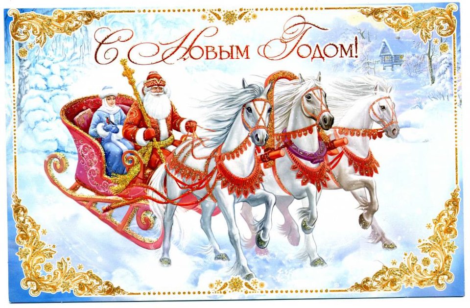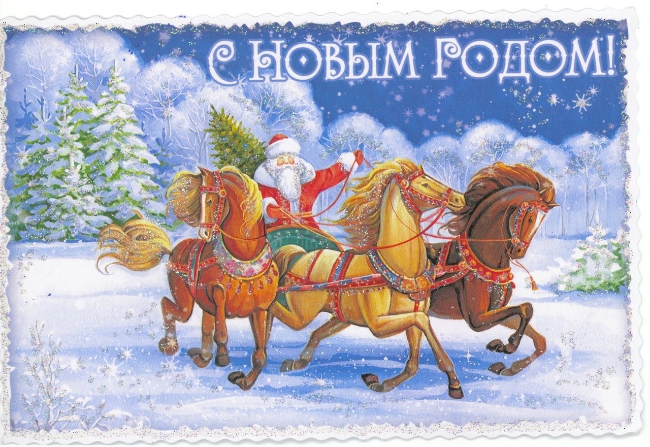 Новогодние открытки с тройкой лошадей