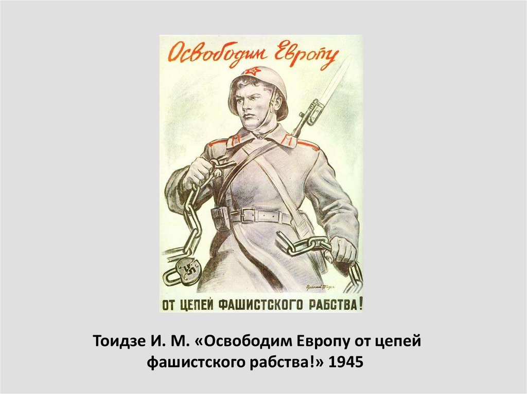 ![Плакат Тоидзе «освободим Европу от цепей фашистского рабства!» (1945)]()