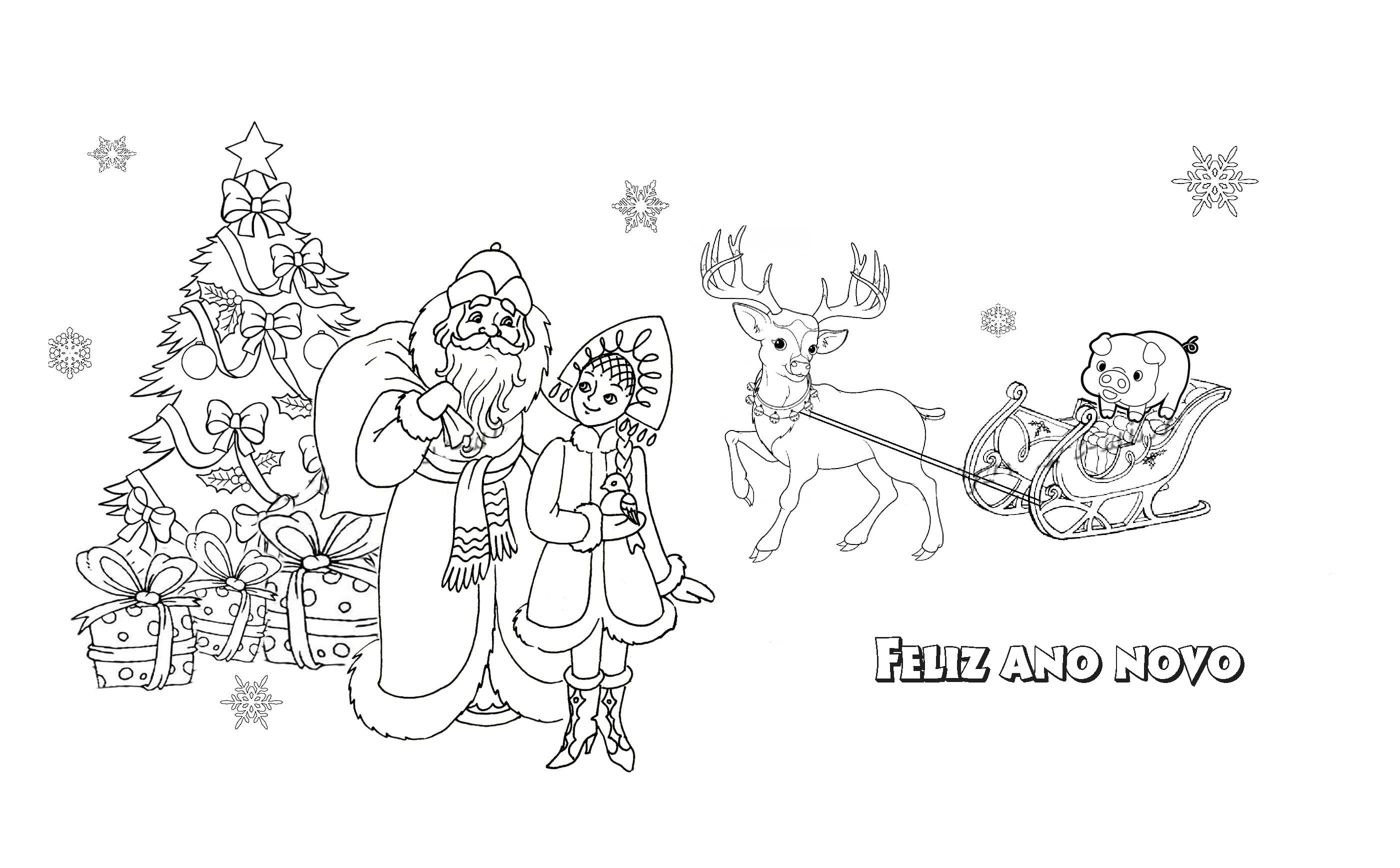 Раскраска дед Мороз Снегурочка олени