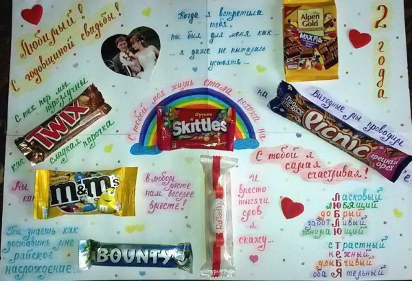 ![Подарок мужу из сладостей на плакате]()