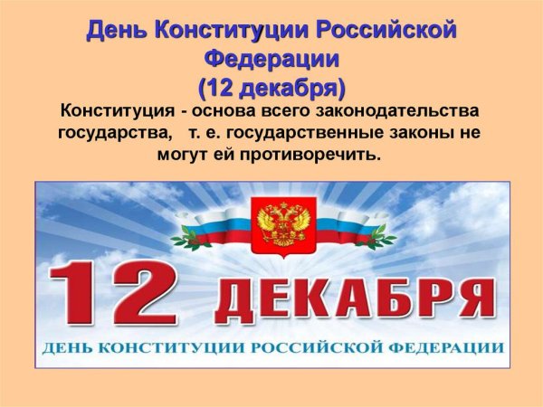 12 декабря - это особый день для России, ведь в этот день отмечается День Конституции Российской Федерации. Наша конституция - это основной закон страны, который определяет права и обязанности граждан, принципы организации государственной власти, а также гарантирует защиту основных свобод и прав. В честь этого важного события, по всей стране развешиваются плакаты, напоминающие о значимости нашего конституционного строя. Плакаты становятся не только яркими элементами уличного декора, но и символом единства, где каждый гражданин может найти себя и свои права, защищенные Конституцией. Этот день - возможность подумать о важности правовых норм, о ценности нашего гражданского общества и о том, какую ответственность мы несем перед нашей страной.