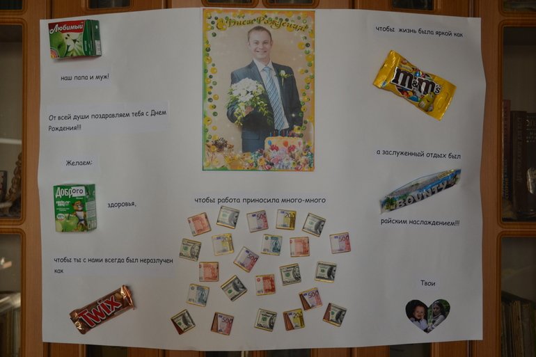 ![Поздравление на плакате с шоколадками]()