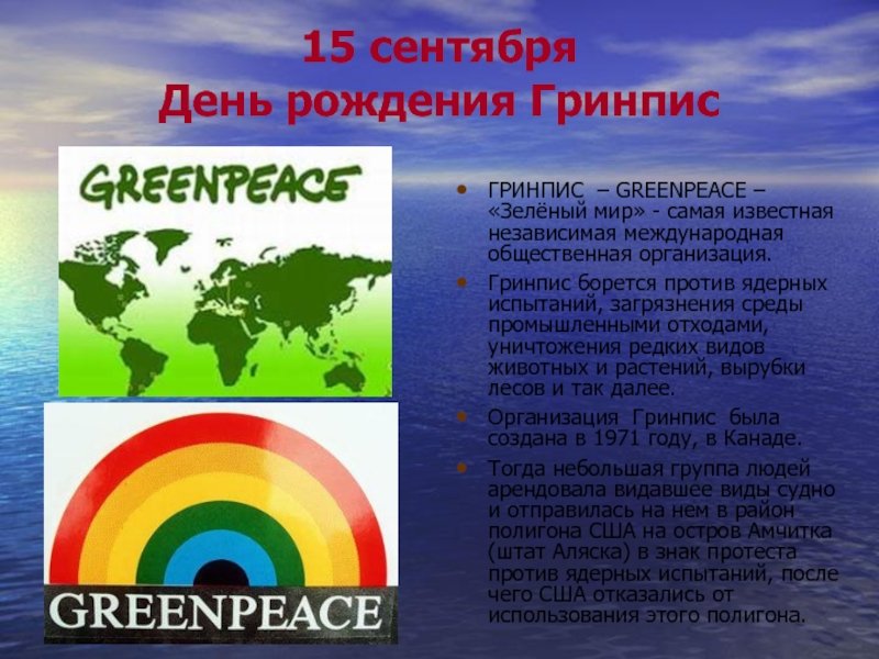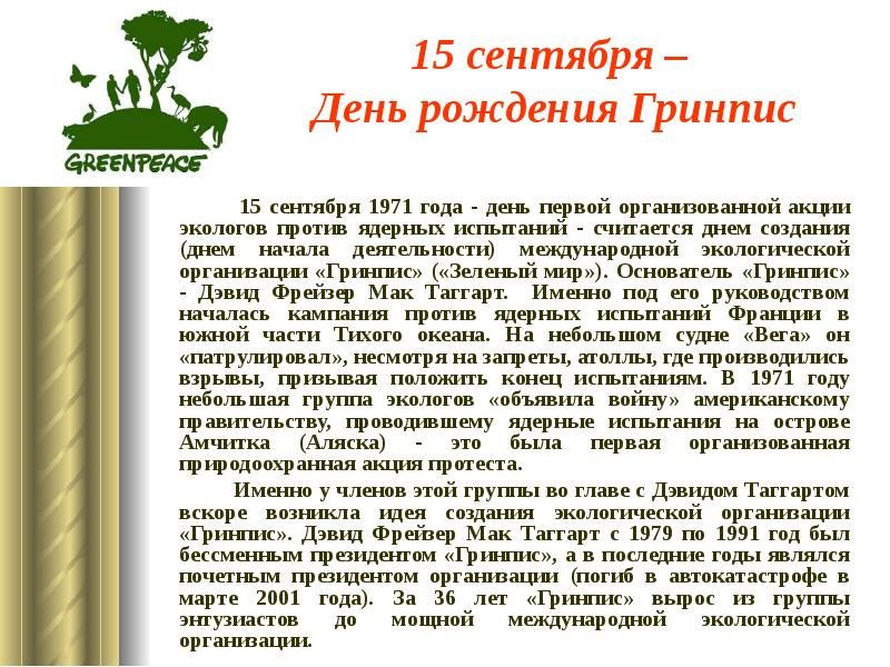 ![15 Сентября - день рождения Гринпис (Международная независимая]()