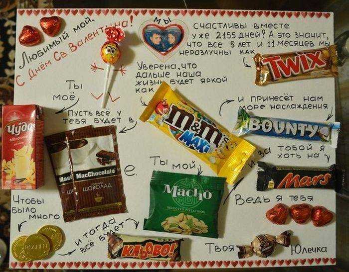 ![Подарок на ватмане со сладостями]()
