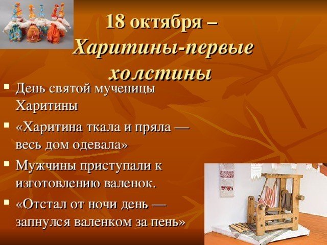 ![Харитины первые холстины 18 октября народный календарь]()