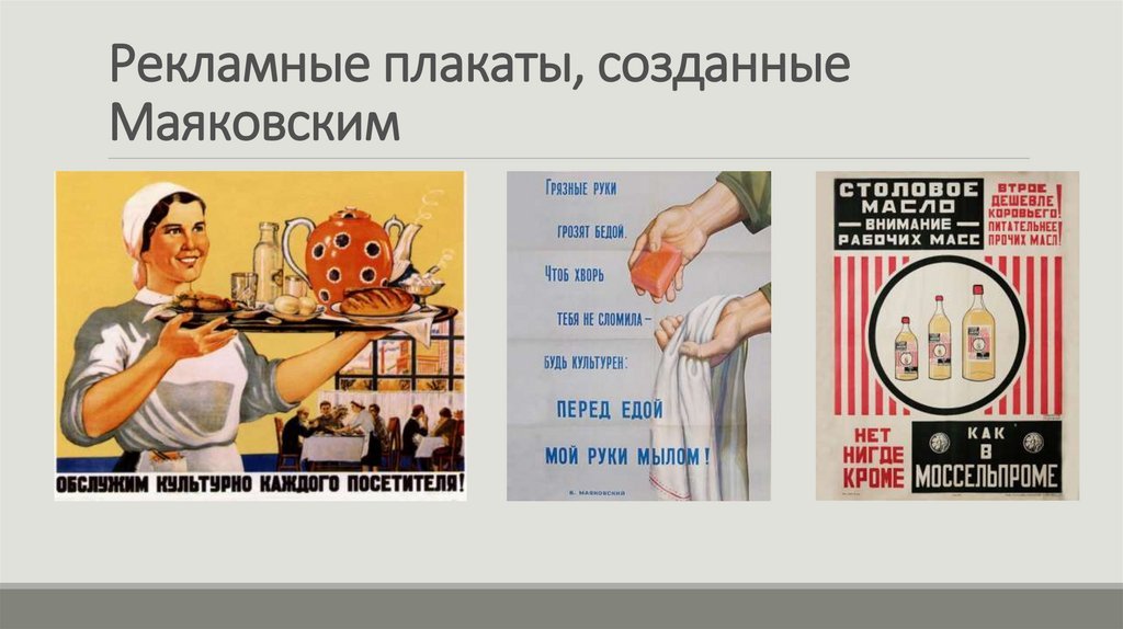 ![Рекламные плакаты с авторством Маяковского]()