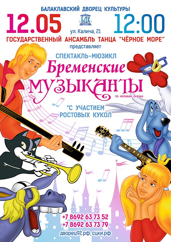 Плакат "Бременские музыканты" - яркое и увлекательное представление для всей семьи. Он основан на знаменитой немецкой сказке братьев Гримм и рассказывает о приключениях четырех животных: осла, пса, кота и петуха, которые решают стать музыкантами и отправиться в Бремен исполнять свою музыку. Путешествие этих необычных друзей наполнено юмором, весельем и добрыми поучениями. Широкий выбор музыкальных номеров, яркие костюмы и талантливые актеры создают неповторимую атмосферу, которая захватывает зрителей с первых минут спектакля. Плакат "Бременские музыканты" - это отличный выбор для любителей театра и сказочных историй, гарантирующий отличное времяпровождение и незабываемые впечатления.