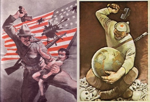 ![Антиамериканские плакаты холодной войны]()
