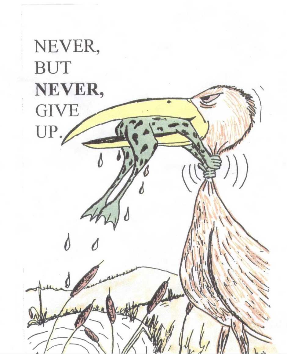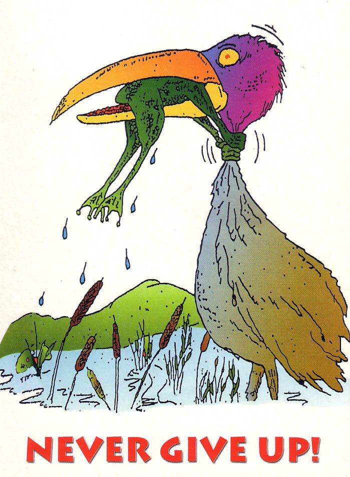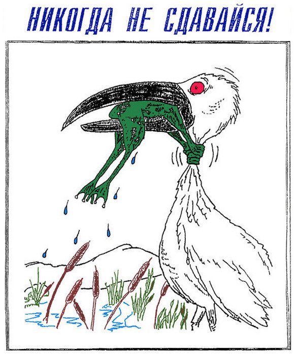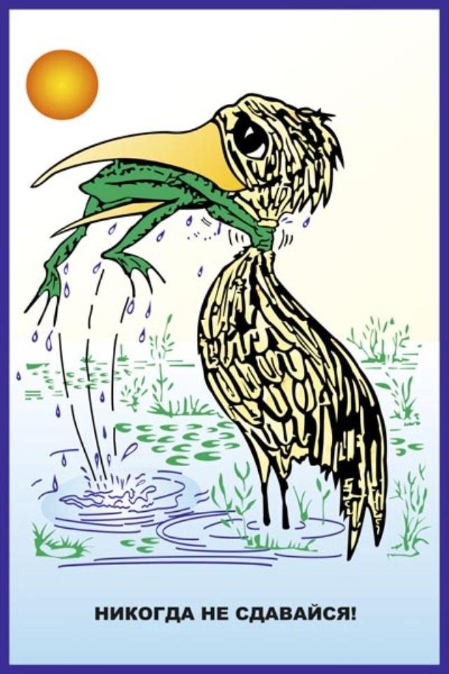 ![Плакат никогда не сдавайся с цаплей и лягушкой]()