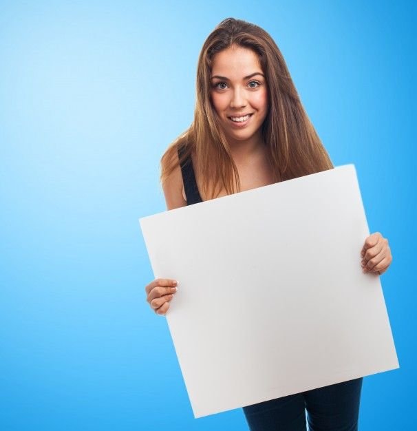 ![Девушка с табличкой в руках]()