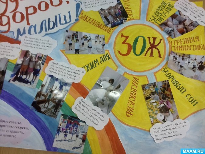 Плакат "Здоровый образ жизни в детском саду" представляет собой яркое и информативное изображение, которое направлено на пропаганду здорового образа жизни среди детей. На плакате можно увидеть различные элементы, например, рисунки фруктов и овощей, детей, занимающихся спортом, а также правила, напоминающие о необходимости правильного питания и активной физической активности. Этот плакат задумывается как инструмент для воспитания детей и формирования у них положительных привычек, связанных со здоровым образом жизни. Он может быть использован в детских садах, школах и других образовательных учреждениях для мотивации детей к заботе о своем здоровье и принятии правильных жизненных выборов.