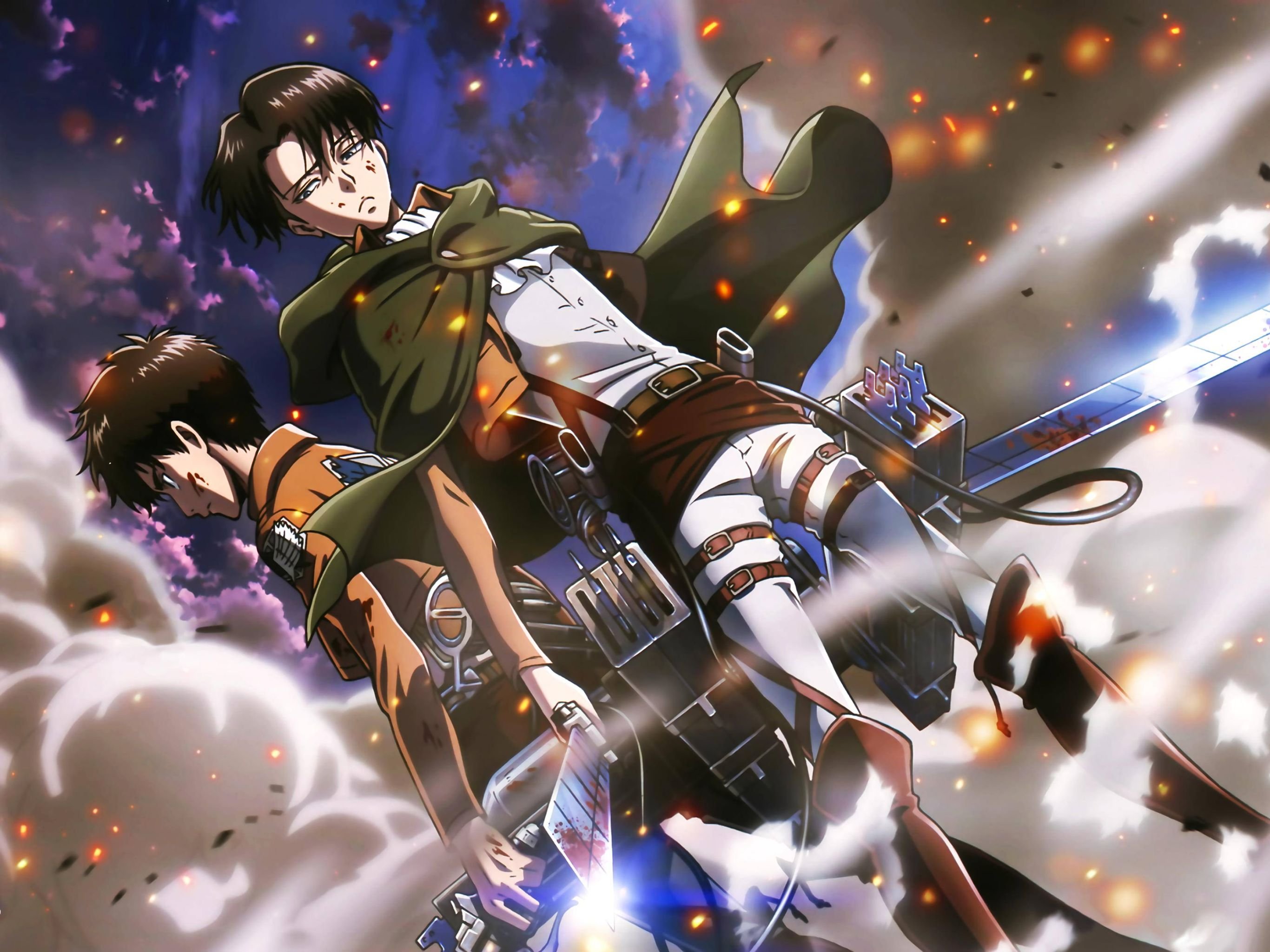 ![Атака титанов Леви и Эрен и Микаса]()