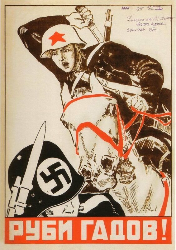 ![Плакат Виктора Дени «Убей фашиста- изувера!» (1942)]()