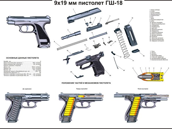 ![Основные части пистолета Грязева Шипунова ГШ-18]()