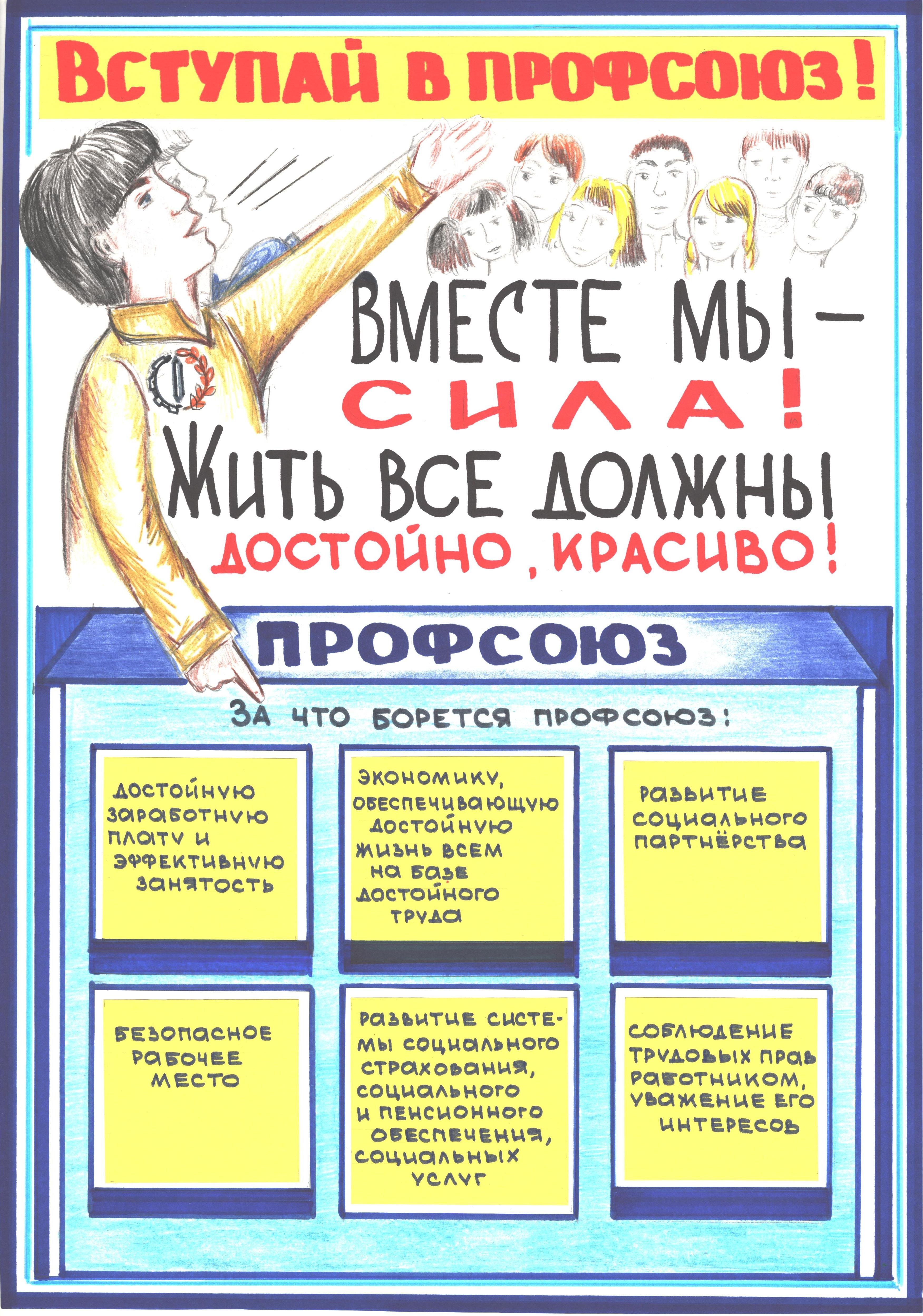 Профсоюз - это организация, созданная для защиты трудовых прав и интересов работников. Плакат профсоюза является мощным средством коммуникации, которое привлекает внимание и передает важные сообщения. Он может содержать информацию о преимуществах членства в профсоюзе, о том, какую поддержку и защиту он предоставляет своим членам. Красочный дизайн плаката с яркими изображениями и убедительными слоганами помогает привлечь внимание к проблемам и вызывает эмоциональную реакцию у зрителей. Плакат профсоюза может также информировать о предстоящих мероприятиях или акциях, чтобы привлечь новых членов и мобилизовать существующих. В целом, плакат профсоюза является эффективным инструментом пропаганды и информирования, который помогает повысить осведомленность о профсоюзных целях и достижениях.