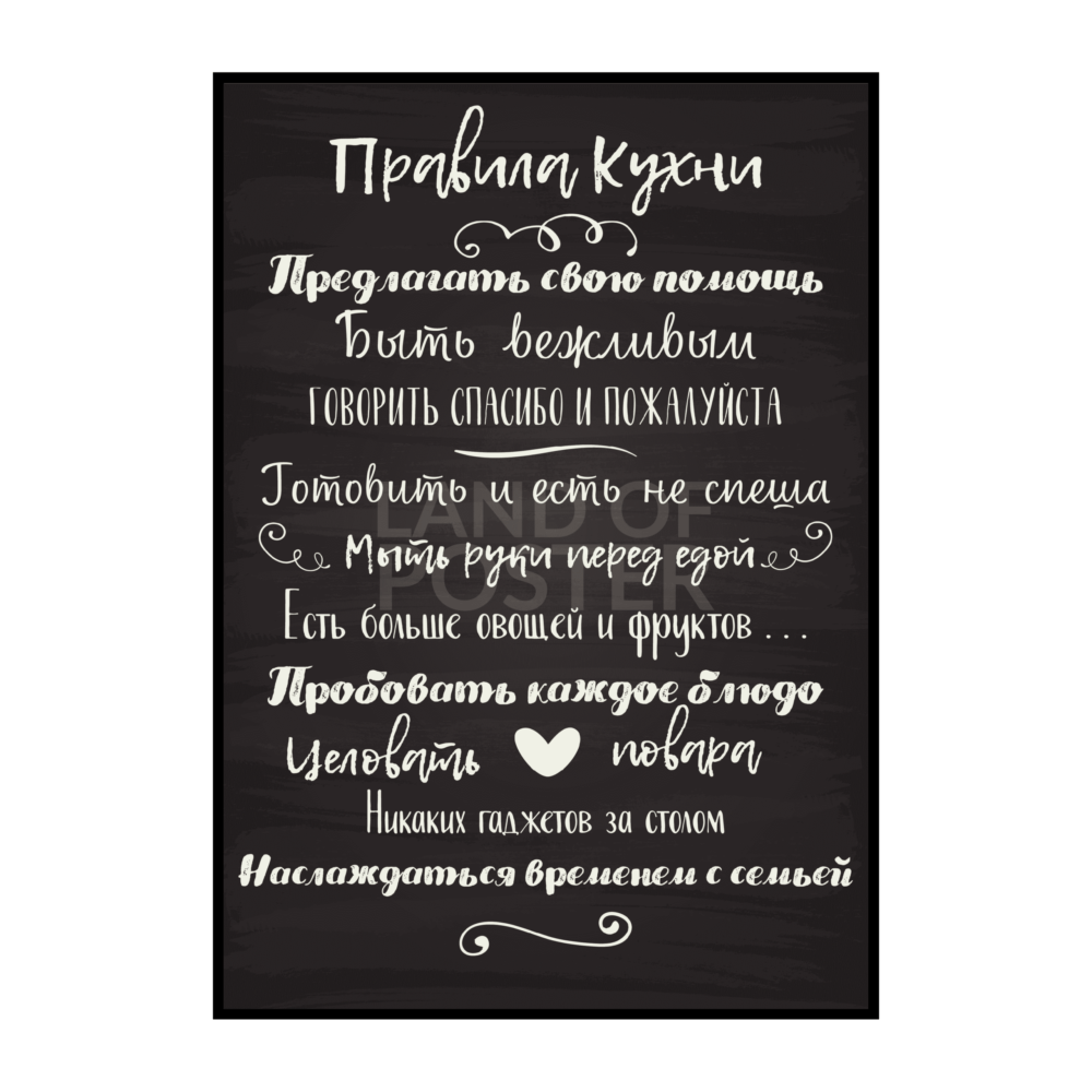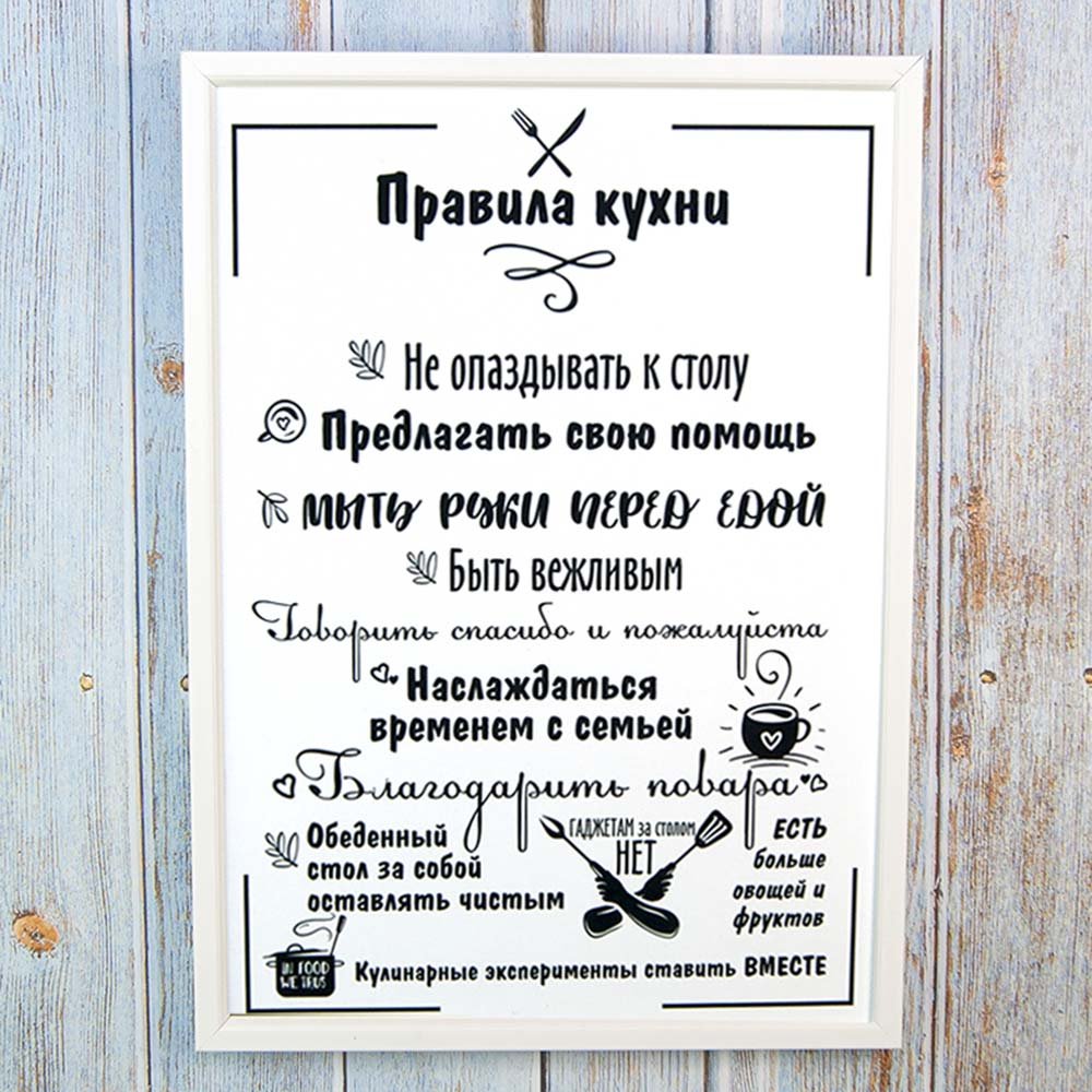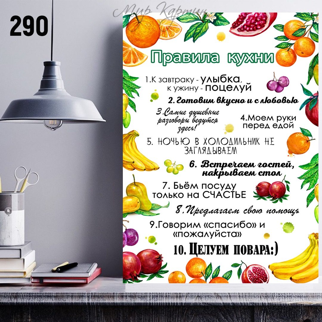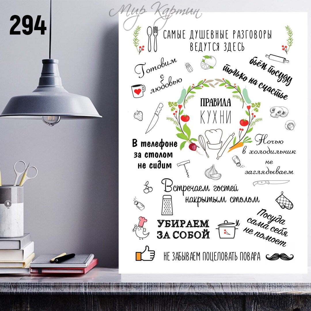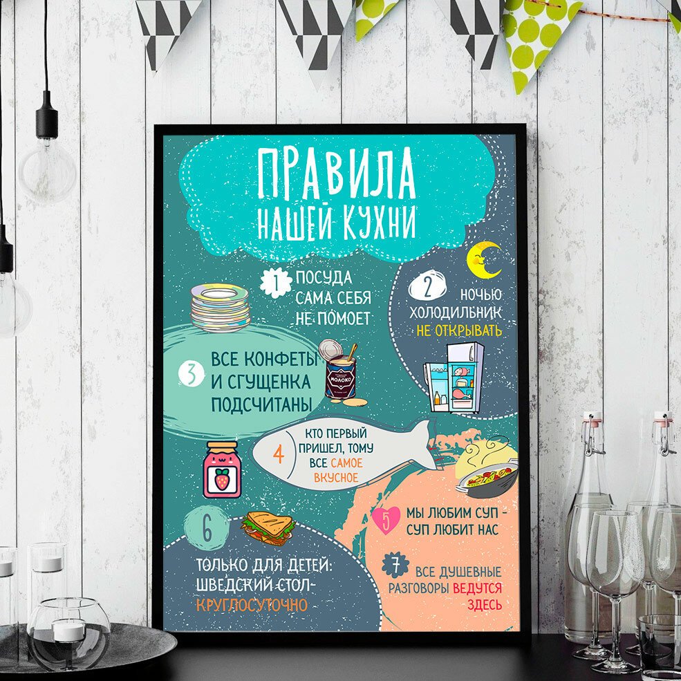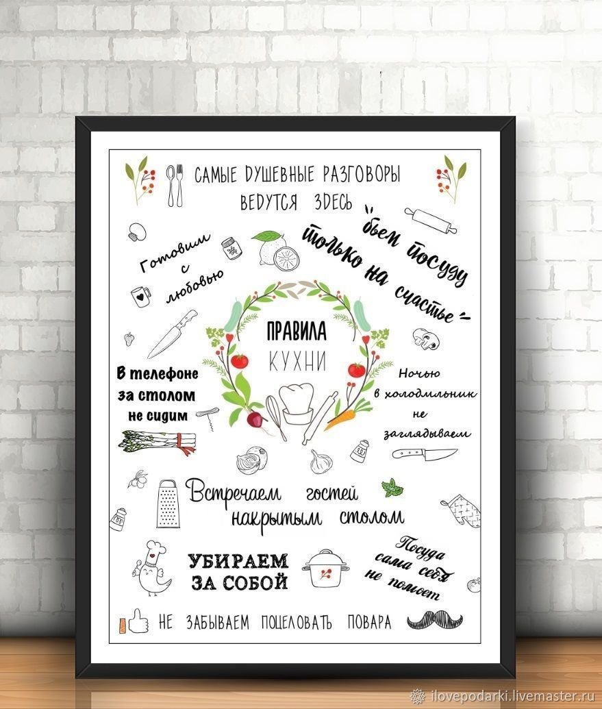 Правила кухни – это стильный и информативный постер, который станет отличным дополнением к любому интерьеру вашей кухни. На нем представлены основные правила, которые помогут вам сохранить порядок и организованность на вашей кухне. От "Всегда убирайте за собой" до "Используйте острый нож безопасно", эти правила напомнят вам о важности гигиены, безопасности и здорового питания. Благодаря своему яркому и привлекательному дизайну, этот постер не только полезен, но и станет интересным элементом декора вашего кухонного пространства.