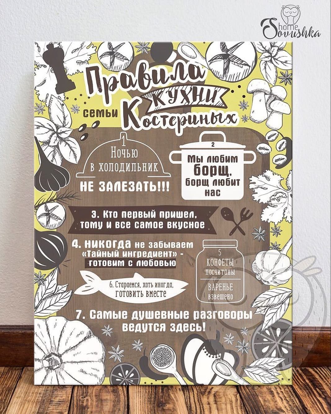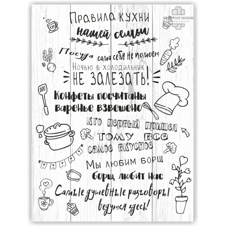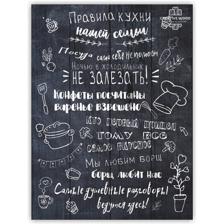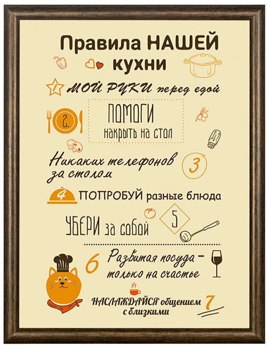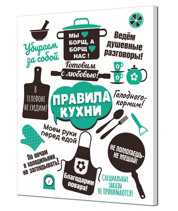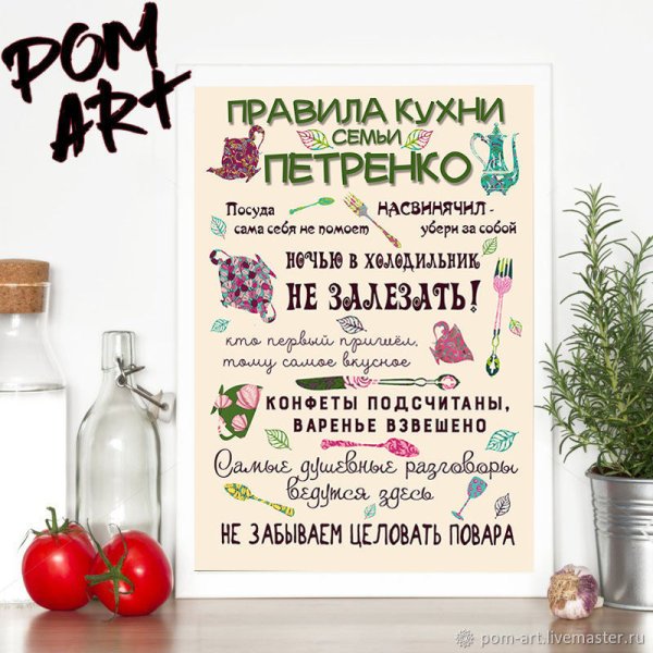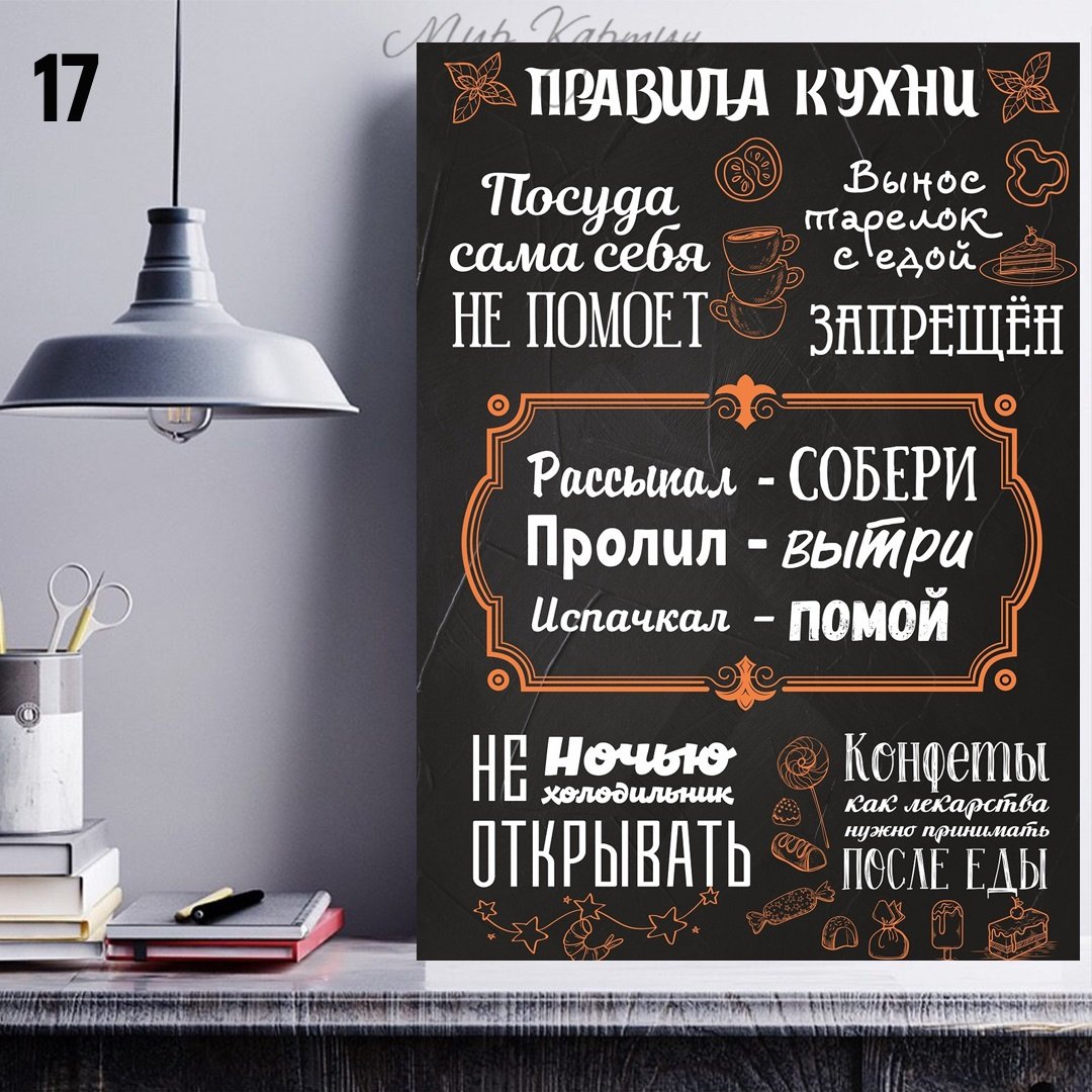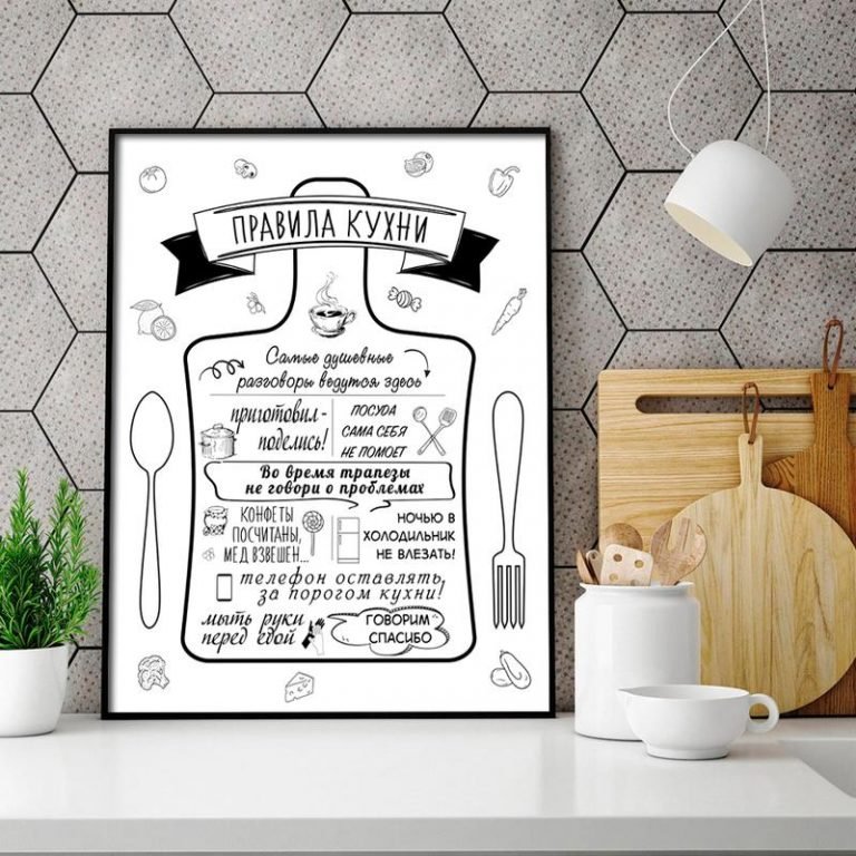 Правила кухни – это стильный и информативный постер, который станет отличным дополнением к любому интерьеру вашей кухни. На нем представлены основные правила, которые помогут вам сохранить порядок и организованность на вашей кухне. От "Всегда убирайте за собой" до "Используйте острый нож безопасно", эти правила напомнят вам о важности гигиены, безопасности и здорового питания. Благодаря своему яркому и привлекательному дизайну, этот постер не только полезен, но и станет интересным элементом декора вашего кухонного пространства.