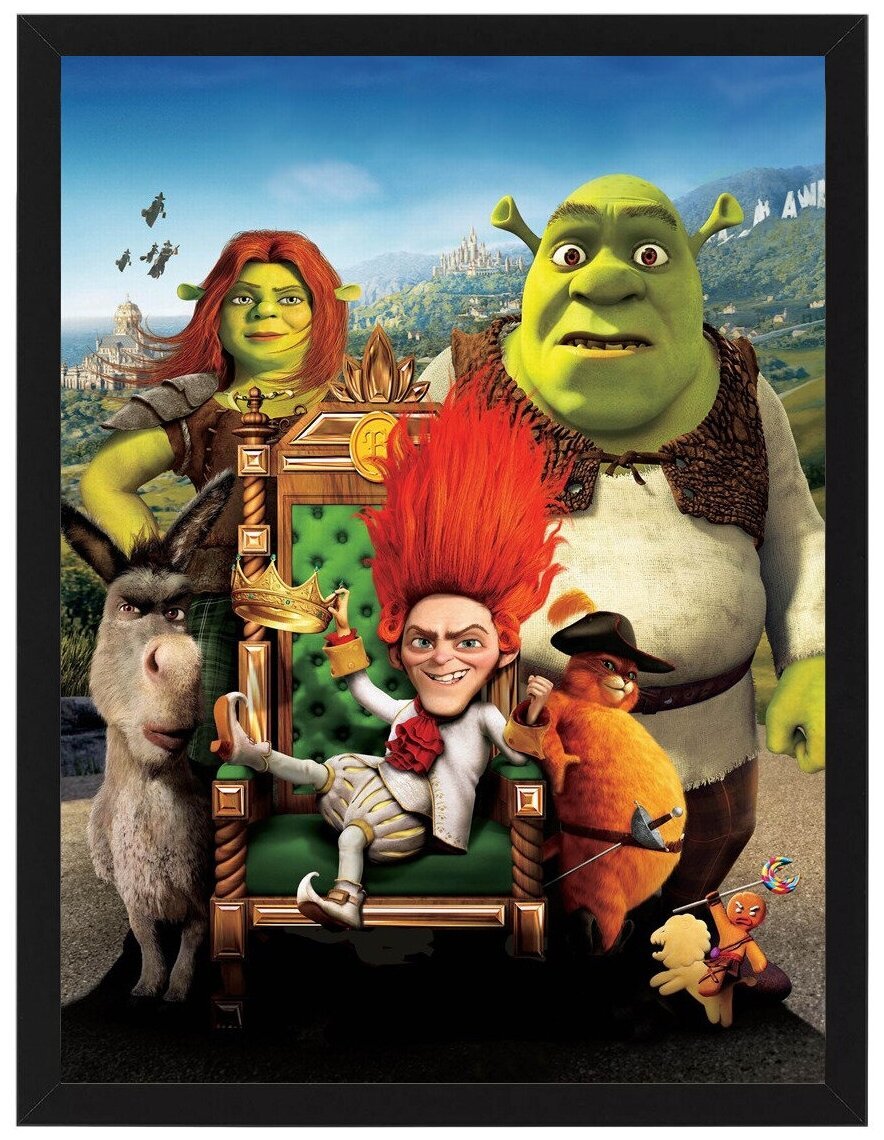 На постере фильма "Шрек навсегда" ты сразу понимаешь, что тебя ждет веселое и захватывающее приключение. В центре изображения главный герой - Шрек, зеленый огр с необычным чувством юмора. Он улыбается и демонстрирует свою харизму, словно приглашая каждого зрителя стать частью его невероятного мира. Рядом с Шреком на постере можно заметить его верного друга и спутника Пушистого Барашка, а также Фиону, прекрасную принцессу, которая обладает силой и уверенностью. Вокруг них разворачивается калейдоскоп ярких и забавных персонажей, созданных с любовью и творчеством. Постер "Шрек навсегда" приковывает взгляд и вызывает желание познакомиться с этим уникальным миром и его необычными обитателями. Это фильм, который переполняет сердце радостью и позитивной энергией, и поэтому он станет отличным выбором для всей семьи.