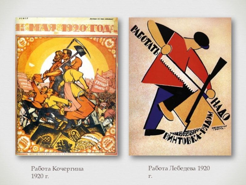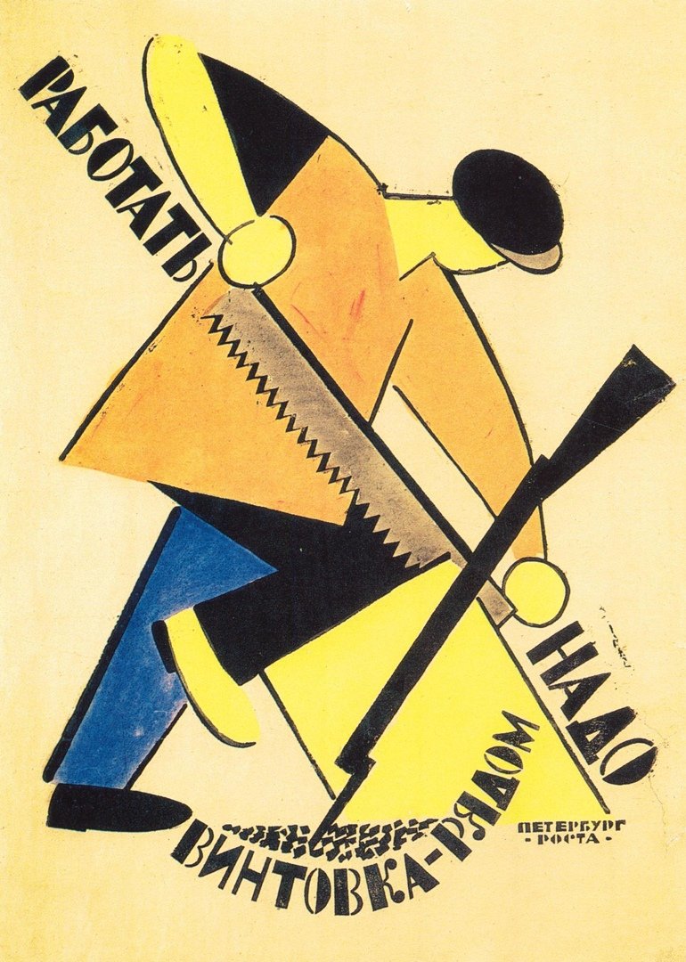 ![Владимир Лебедев, плакат «работать надо — винтовка рядом!» (1921)]()