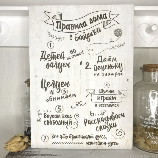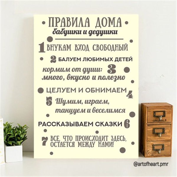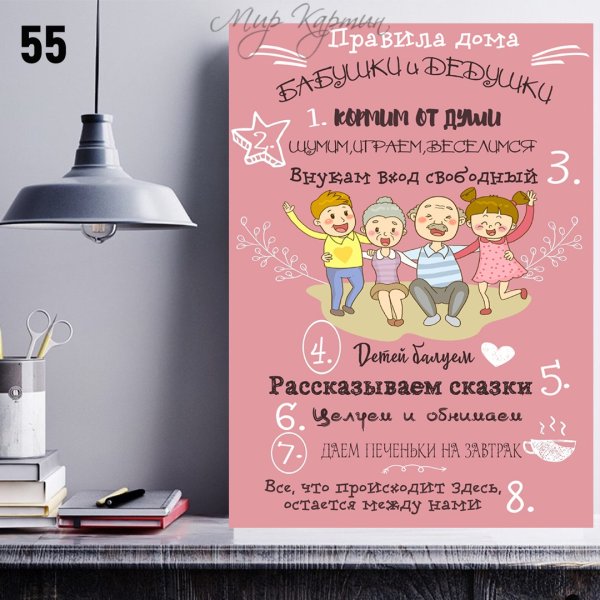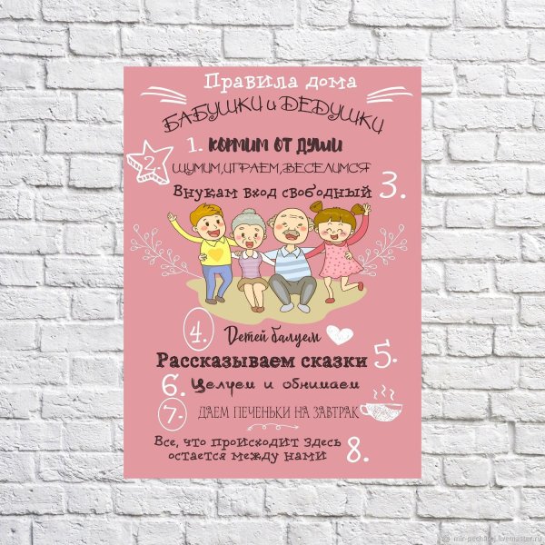 "Правила дома бабушки" - это уникальный постер, который станет неотъемлемой частью вашего интерьера. Он напомнит вам о важных принципах и правилах, которые соблюдаются в этом доме. Бабушка, как хранительница семейных традиций и ценностей, всегда ставит на первое место любовь, заботу и уважение друг к другу. На постере вы найдете такие правила, как "Будь вежливым и благодарным", "Помогай другим", "Цени семейные моменты" и многие другие. Этот постер поможет создать атмосферу гармонии и доброты в вашем доме и будет напоминать о важности семейных ценностей каждый день.