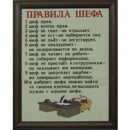 "Правила шефа" - это постер, который прекрасно подойдет для офисной или домашней обстановки. Он содержит набор основных принципов и правил, которые должен придерживаться каждый руководитель или начальник. На этом постере вы найдете мудрые и вдохновляющие цитаты о лидерстве, командной работе, мотивации и планировании. Этот постер станет отличным напоминанием для всех, кто стремится быть эффективным лидером и достигать успеха в своей профессии. Разместите его на видном месте и дайте своим сотрудникам возможность наблюдать за этими правилами каждый день.