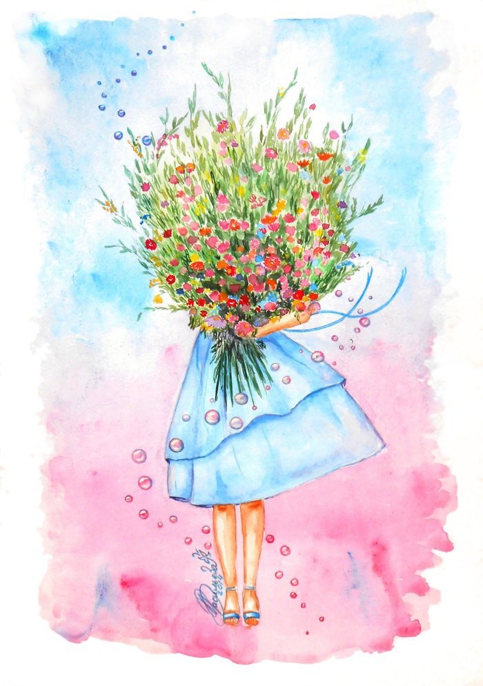 ![Нарисованная девушка с букетом]()